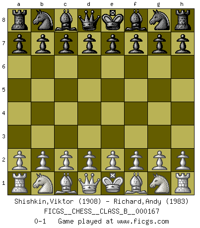 Last move : 0-1 2012 March 26 22:37:41 [Event "FICGS__CHESS__CLASS_B__000167"] [Site "FICGS"] [Date "2012.02.15"] [Round "1"] [White "Shishkin,Viktor"] [Black "Richard,Andy"] [Result "0-1"] [WhiteElo "1908"] [BlackElo "1983"] 0-1 This chess game has been lost on time (started : 2012.02.15 15:16:18) Player Black won this chess game. Follow this game move after move (download)Methodical thinking is of more use in Chess than inspiration. (C. J. S. Purdy) Die westlichen Werte sind eine Sprache, welche die Putin-Administration nicht versteht. (Garry Kasparov) El Ajedrez es como la guerra en un tablero. (Bobby Fischer) 'L'échange des dames est un coup dur pour les deux adversaires...' Un journaliste lors d'une partie du match Spassky-Fischer In fact if nothing is done against this teddy bear, hereby I announce that I would quit chess, rapid chess, blitz chess, postal chess, email chess, server chess and correspondence chess I will then switch to a table game where teddy bears aren't going to be seen for a while, like Poker, or Roulette, all 18+ games. (Elmer Valderrama)