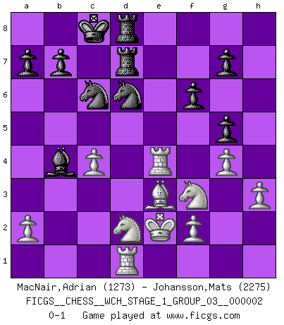 Last move : 0-1 2007 March 3 20:17:14 [Event "FICGS__CHESS__WCH_STAGE_1_GROUP_03__000002"] [Site "FICGS"] [Date "2007.01.16"] [Round "1"] [White "MacNair,Adrian"] [Black "Johansson,Mats"] [Result "0-1"] [WhiteElo "1273"] [BlackElo "2275"] 1.e4 c5 2.Bc4 Nc6 3.Nf3 e6 4.c3 d5 5.exd5 exd5 6.Bb3 Qe7+ 7.Qe2 Qxe2+ 8.Kxe2 c4 9.Bc2 Bg4 10.Re1 O-O-O 11.d4 cxd3+ 12.Bxd3 d4 13.h3 Bh5 14.Bf4 Nge7 15.Nbd2 dxc3 16.bxc3 Bg6 17.Bxg6 hxg6 18.c4 Nf5 19.Rad1 Bb4 20.Kf1 f6 21.Re4 g5 22.Be3 Rd7 23.Ke2 Rhd8 24.g4 Nd6 0-1 Sicilian defense Queenside Castling by player Black (move 10) Player Black won this chess game. Follow this game move after move (download)The King is a fighting piece. Use it ! (Wilhelm Steinitz) Es hat in meinem Leben Zeiten gegeben, in denen das Schachspiel, wenn nicht zum Lebenszweck, so doch zu einem regelrechten Lebensersatz geworden ist. Man fühlt sich in solchen Zeiten nicht so, als besäße man eine göttliche Gabe, sondern eher so, als sei man von ihr besessen. (Garry Kasparov) Si tu oponente te ofrece un empate, trata de averiguar porque piensa él que esta en una posición peor. (Nigel Short) Dieu déplace le joueur, et celui-ci la pièce. Quel Dieu derrière Dieu commence donc la trame ? Arturo Perez-Reverte (prix de littérature policière 1993). No, I am still playing. (Anatoly Karpov)