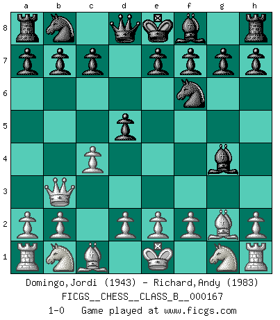 Last move : 1-0 2012 March 29 10:48:16 [Event "FICGS__CHESS__CLASS_B__000167"] [Site "FICGS"] [Date "2012.02.15"] [Round "1"] [White "Domingo,Jordi"] [Black "Richard,Andy"] [Result "1-0"] [WhiteElo "1943"] [BlackElo "1983"] 1.g4 d5 2.Bg2 Bxg4 3.c4 Nf6 4.Qb3 1-0 This chess game has been lost on time (started : 2012.02.15 15:16:18) Grob : Fritz gambit Player White won this chess game. Follow this game move after move (download)Chess is war over the board. The object is to crush the opponents mind. (Bobby Fischer) Mein Name ist Rustam Kamsky. Sie haben meinen Sohn belästigt. Bereiten Sie sich aufs Sterben vor. (Rustam Kamsky) Cualquier cambio de material en una posición debe venir por medio de un mate, una captura o promoción de Peón. (Purdy) En blitz, le Cavalier l'emporte sur le Fou. (Vlastimil Hort) Inventor: A person who makes an ingenious arrangement of wheels, levers and springs, and believes it civilization. (Ambrose Bierce, The Devil's Dictionary)