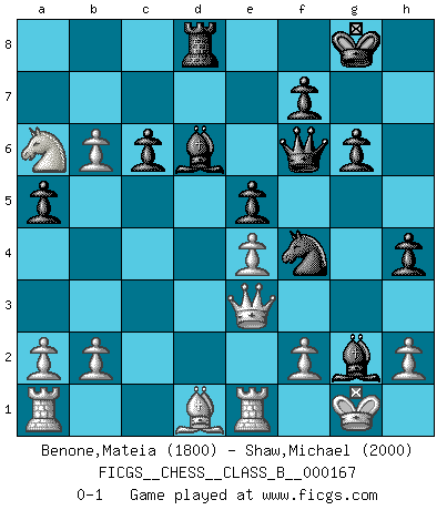 Last move : 0-1 2012 August 29 3:53:48 [Event "FICGS__CHESS__CLASS_B__000167"] [Site "FICGS"] [Date "2012.02.15"] [Round "1"] [White "Benone,Mateia"] [Black "Shaw,Michael"] [Result "0-1"] [WhiteElo "1800"] [BlackElo "2000"] 1.Nf3 Nf6 2.c4 g6 3.Nc3 Bg7 4.e4 d6 5.d4 O-O 6.Be2 e5 7.d5 a5 8.O-O Na6 9.Bd3 Nc5 10.Bc2 Nh5 11.Bg5 Bf6 12.Be3 Nf4 13.Re1 Bg7 14.Qd2 Qf6 15.Nb5 Bg4 16.Nxe5 dxe5 17.Bxc5 Bh3 18.Bxf8 Bxg2 19.Qe3 Bxf8 20.d6 c6 21.Nc7 Rd8 22.c5 h5 23.Bd1 b6 24.cxb6 Bxd6 25.Na6 h4 0-1 This chess game has been lost on time (started : 2012.02.15 15:16:18) Reti Opening Kingside Castling by player Black (move 5) Kingside Castling by player White (move 8) Player Black won this chess game. Follow this game move after move (download)The defensive power of a pinned piece is only imaginary. (Aaron Nimzovich) Der Schachmeister von Heute braucht Courage, einen Killerinstinkt, Ausdauer und Arroganz. (Larry Evans) El Ajedrez es un terrible juego. Si no controlas el centro, tu oponente tiene una posición mas holgada. Si tienes control del centro, ¡entonces realmente tu tienes algo de que preocuparte!. (Siegbert Tarrasch) Les Echecs ne sont pas pour les âmes timides. Ils requièrent un homme entier, qui ne s'arrête pas aveuglément à ce qui a été déjà établi, mais qui tente individuellement de sonder les profondeurs du jeu. (W. Steinitz) Wisdom doesn't necessarily come with age. Sometimes age just shows up all by itself. (Tom Watson)