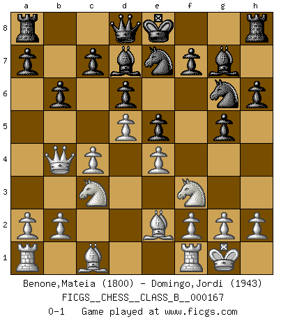 Last move : 0-1 2012 May 26 2:15:56 [Event "FICGS__CHESS__CLASS_B__000167"] [Site "FICGS"] [Date "2012.02.15"] [Round "1"] [White "Benone,Mateia"] [Black "Domingo,Jordi"] [Result "0-1"] [WhiteElo "1800"] [BlackElo "1943"] 1.Nf3 h6 2.c4 g5 3.d4 Bg7 4.e3 d6 5.Be2 Nc6 6.O-O e5 7.d5 Nce7 8.Nc3 Ng6 9.Qa4+ Bd7 10.Qb4 b6 11.e4 N8e7 0-1 This chess game has been lost on time (started : 2012.02.15 15:16:18) Reti Opening Kingside Castling by player White (move 6) Player Black won this chess game. Follow this game move after move (download)In life, as in Chess, one's own Pawns block one's way. A man's very wealth, ease, leisure, children, books, which should help him to win, more often checkmate him. (Charles Buxton) Im Internet Chess Club betrug mein Rating vorübergehend 3350 ELO-Punkte. (Sergej Karjakin) El pensamiento metódico es mas útil en el Ajedrez que la inspiración. (C. J. S. Purdy) La vie est comme un jeu d'échecs : nous esquissons un plan, mais celui-ci est tributaire de ce que daignent faire l'adversaire aux échecs et le destin dans la vie. (Arthur Schopenhauer) Being number two sucks. (Andre Agassi)