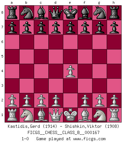 Last move : 1-0 2012 March 26 22:37:41 [Event "FICGS__CHESS__CLASS_B__000167"] [Site "FICGS"] [Date "2012.02.15"] [Round "1"] [White "Kastidis,Gerd"] [Black "Shishkin,Viktor"] [Result "1-0"] [WhiteElo "1914"] [BlackElo "1908"] 1.e4 1-0 This chess game has been lost on time (started : 2012.02.15 15:16:18) King's pawn Opening Player White won this chess game. Follow this game move after move (download)We must make sure that Chess will not be like a dead language, very interesting, but for a very small group. (Sytze Faber) Ein guter Spieler hat immer Glück. (José Raúl Capablanca) El juego de Damas es para vagabundos. (Paul Morphy) Aux échecs, les retours au sommet sont rares : les dommages psychologiques consécutifs à une défaite sont trop sévères. (Daily Telegraph) Memory is a crazy woman that hoards colored rags and throws away food. (Austin O'Malley)