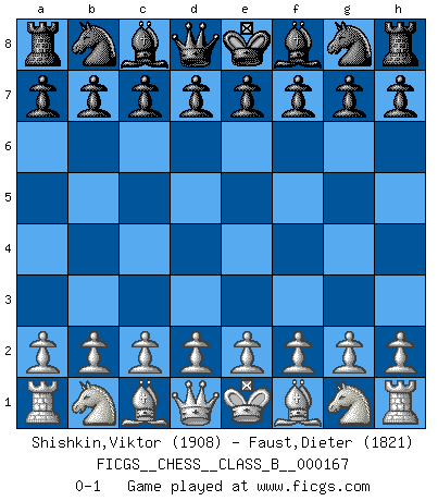Last move : 0-1 2012 March 26 22:37:41 [Event "FICGS__CHESS__CLASS_B__000167"] [Site "FICGS"] [Date "2012.02.15"] [Round "1"] [White "Shishkin,Viktor"] [Black "Faust,Dieter"] [Result "0-1"] [WhiteElo "1908"] [BlackElo "1821"] 0-1 This chess game has been lost on time (started : 2012.02.15 15:16:18) Player Black won this chess game. Follow this game move after move (download)Chess is a foolish expedient for making idle people believe they are doing something very clever when they are only wasting their time. (George Bernard Shaw) Auf Remis zu spielen ist gewissermaßen ein Verbrechen gegen das Schachspiel. (Mikhail Nekhemyevich Tal) Solo puedes ser bueno en el Ajedrez si amas al juego. (Bobby Fischer) Il n'y a pas de prix trop élevé au scalp de l'ennemi. (Koblentz) When I took office, only high energy physicists had ever heard of what is called the World Wide Web... Now even my cat has its own page. (Bill Clinton, 1996)
