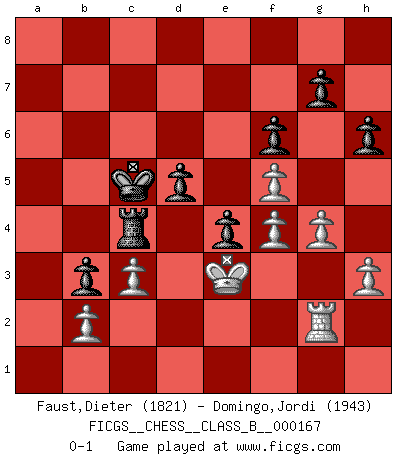 Last move : 0-1 2012 May 13 13:10:44 [Event "FICGS__CHESS__CLASS_B__000167"] [Site "FICGS"] [Date "2012.02.15"] [Round "1"] [White "Faust,Dieter"] [Black "Domingo,Jordi"] [Result "0-1"] [WhiteElo "1821"] [BlackElo "1943"] 1.e4 h6 2.d4 c5 3.Nf3 cxd4 4.Nxd4 a6 5.Nc3 e5 6.Nf5 Nf6 7.Bc4 d6 8.O-O Be6 9.Qd3 Nc6 10.Rd1 Rc8 11.a3 Bxc4 12.Qxc4 Nd4 13.Qd3 Nxf5 14.exf5 Qd7 15.h3 Be7 16.Re1 O-O 17.Bd2 Rfe8 18.Re2 Bd8 19.Rae1 Qc6 20.Kf1 Bc7 21.Ne4 Nxe4 22.Qxe4 Qxe4 23.Rxe4 d5 24.R4e2 Red8 25.c3 f6 26.Rd1 Bb6 27.f4 e4 28.Be3 Bxe3 29.Rxe3 Kf7 30.Kf2 b5 31.Re2 Ke7 32.Red2 Rc5 33.Rd4 Rd7 34.Ke3 Kd8 35.a4 a5 36.axb5 Rxb5 37.Ra1 Kc7 38.Ra2 Kc6 39.Rd2 Rdb7 40.Kd4 a4 41.Rc2 Ra7 42.Ra3 Rc5 43.Ke3 Rc4 44.Rd2 Rb7 45.g4 Kc5 46.Rg2 Rb3 47.Rxb3 axb3 0-1 Carr's defense Kingside Castling by player White (move 8) Kingside Castling by player Black (move 16) Player Black won this chess game. Follow this game move after move (download)Nowadays, when you're not a grandmaster at 14, you can forget about it. (Anand Viswanathan) Es war undenkbar für die Behörden, dass ein sowjetischer Großmeister auf diese Art und Weise [Fischer-Taimanov 6:0] verliert, ohne dass es eine politischer Erklärung dafür gäbe. (Mark Taimanov) Yo siempre he tenido un ligero sentimiento de lástima por una persona que no tiene conocimiento del Ajedrez. (Siegbert Tarrasch) Lorsque vous vous retrouvez devant une position atroce, ne tendez pas un ultime piège dérisoire avec l'intention d'abandonner si l'adversaire le déjoue ! Faites-vous plutôt un devoir de résister comme si votre vie en dépendait. Jouez le coup qui vous déplairait au centuple si vous étiez dans la peau de votre tortionnaire ! Luck is when opportunity knocks and you answer. (Anonymous)