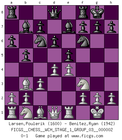 Last move : 0-1 2007 March 13 19:37:57 [Event "FICGS__CHESS__WCH_STAGE_1_GROUP_03__000002"] [Site "FICGS"] [Date "2007.01.16"] [Round "1"] [White "Larsen,Poulerik"] [Black "Benitez,Ryan"] [Result "0-1"] [WhiteElo "1600"] [BlackElo "1942"] 1.e4 e5 2.Nf3 Nc6 3.Bb5 a6 4.Ba4 Nf6 5.O-O b5 6.Bb3 Be7 7.Re1 O-O 8.c3 Bb7 9.d4 d6 0-1 This chess game has been lost on time (started : 2007.01.16 15:13:54) Ruy Lopez : 5.O-O Kingside Castling by player White (move 5) Kingside Castling by player Black (move 7) Player Black won this chess game. Follow this game move after move (download)Chess is a sea in which a gnat may drink and an elephant may bathe. (Hindu proverb) Im Leben werden Partien nie so unstrittig gewonnen wie im Spiel (Emanuel Lasker) No existe un remordimiento como el remordimiento del Ajedrez. (H. G. Wells) L'ordinateur a tué l'originalité. Il n'y a plus guère d'aventures sur l'échiquier. (Jacob Murray) Now the reason the enlightened prince and the wise general conquer the enemy whenever they move and their achievements surpass those of ordinary men is foreknowledge. (Sun Tzu)