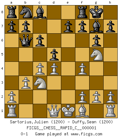 Last move : 0-1 2006 July 20 2:19:46 [Event "FICGS__CHESS__RAPID_C__000001"] [Site "FICGS"] [Date "2006.05.12"] [Round "1"] [White "Sartorius,Julien"] [Black "Duffy,Sean"] [Result "0-1"] [WhiteElo "1200"] [BlackElo "1200"] 1.d4 Nf6 2.Nf3 g6 3.c4 Bg7 4.b3 O-O 5.Nc3 d5 6.Bf4 c6 7.Ng5 Nh5 8.e3 Nxf4 9.exf4 Qb6 0-1 This chess game has been lost on time (started : 2006.05.12 15:29:17) King's Indian : East Indian defense Kingside Castling by player Black (move 4) Player Black won this chess game. Follow this game move after move (download)Capture of the adverse King is the ultimate but not the first object of the game. (William Steinitz) Taktik ist was man tun muß, wenn etwas zu tun ist. Strategie ist was man tun muß, wenn nichts zu tun ist. (Savielly Grigorievitsch Tartakower) Desconfianza es la característica mas necesaria de un jugador de Ajedrez. (Siegbert Tarrasch) RxDa4 pat (...) You know what they say : You lie down with the Devil, you wake up in Hell. (Horatio Caine, C.S.I. Miami)