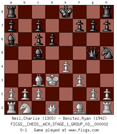 Last move : 0-1 2007 February 22 22:5:35 [Event "FICGS__CHESS__WCH_STAGE_1_GROUP_03__000002"] [Site "FICGS"] [Date "2007.01.16"] [Round "1"] [White "Neil,Charlie"] [Black "Benitez,Ryan"] [Result "0-1"] [WhiteElo "1305"] [BlackElo "1942"] 1.e4 e5 2.Nf3 Nc6 3.d4 exd4 4.Nxd4 Nf6 5.Nxc6 bxc6 6.f3 Bc5 7.Bf4 Nh5 8.Be5 d6 9.Bc3 Qh4+ 10.Kd2 Qg5+ 11.Kd3 Ba6+ 0-1 Scotch : Schmidt variation Player Black won this chess game. Follow this game move after move (download)There are two types of sacrifices: correct ones and mine. (Mikhail Tal) Wie bekannt hörte Morphy 1859 auf, Schach zu spielen. Seine Enttäuschung galt nicht so sehr dem Schach, wie den Schachspielern. (Robert James Fischer) Aquel que teme a un Peón de Reina aislado, debería de retirarse del Ajedrez. (Siegbert Tarrasch) Les Echecs sont et restent toujours un combat, un combat intégral comme la boxe, la lutte ou un autre sport, et où il doit y avoir un vainqueur et un vaincu. (Joseph Emil Diemer) I would love to change the world, but they won't give me the source code. (Unknown)