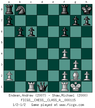 Last move : 1/2-1/2 2012 April 30 19:42:7 [Event "FICGS__CHESS__CLASS_A__000115"] [Site "FICGS"] [Date "2012.02.16"] [Round "1"] [White "Endean,Andrew"] [Black "Shaw,Michael"] [Result "1/2-1/2"] [WhiteElo "2007"] [BlackElo "2000"] 1.d4 Nf6 2.c4 e6 3.Nf3 b6 4.g3 Ba6 5.b3 Bb4+ 6.Bd2 Be7 7.Bg2 c6 8.Bc3 d5 9.Ne5 Ne4 10.O-O Nxc3 11.Nxc3 O-O 12.Rc1 f6 13.Nd3 dxc4 14.Nf4 Qd7 15.bxc4 Bxc4 16.d5 exd5 17.Ncxd5 Bxd5 18.Nxd5 Kh8 19.Nf4 Bd6 20.e3 Bxf4 21.exf4 Qxd1 1/2-1/2 Queen's Indian : Nimzovich variation (exaggerated Fianchetto) Kingside Castling by player White (move 10) Kingside Castling by player Black (move 11) This chess game ended in a draw. Follow this game move after move (download)Play the opening like a book, the middle game like a magician, and the endgame like a machine. (Spielmann) Charakterschwächen offenbaren sich normalerweise während einer Schachpartie. (Garry Kasparov) Las combinaciones han sido siempre el aspecto más intrigante del Ajedrez. Los Maestros las buscan, el público las aplauden, los críticos las alaban. La razón se debe a que las combinaciones hacen posible que el Ajedrez sea más que un ejercicio matemático con una carencia de vida. Ellas son la poesía del juego, son del Ajedrez lo que la melodía es de la música. Ellas representan el triunfo de la mente sobre la materia. (Reuben Fine) Shah mat. Le roi est mort. Cri de fierté d'un joueur venant de terrasser son adversaire, courtoisement, sans effusion de sang. Good luck. You're gonna need it. (Han Solo in Star Wars ep.6)
