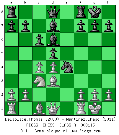 Last move : 0-1 2012 April 2 22:59:41 [Event "FICGS__CHESS__CLASS_A__000115"] [Site "FICGS"] [Date "2012.02.16"] [Round "1"] [White "Delaplace,Thomas"] [Black "Martinez,Chapo"] [Result "0-1"] [WhiteElo "2000"] [BlackElo "2011"] 1.e4 e5 2.Nf3 Nf6 3.d4 Nxe4 4.Bd3 d5 5.Nxe5 Nd7 6.Nxd7 Bxd7 7.O-O Bd6 8.c4 c6 9.Nc3 O-O 0-1 This chess game has been lost on time (started : 2012.02.16 0:11:22) Petrov : Modern attack, Symmetrical variation Kingside Castling by player White (move 7) Kingside Castling by player Black (move 9) Player Black won this chess game. Follow this game move after move (download)The way he plays Chess demonstrates a man's whole nature. (Stanley Ellin) Mit Schach schule ich mein Gefühl für Geometrie, was für Tennis und Schach gleichermaßen wichtig ist. (Boris Becker) Vive, pierde y aprende al observar a tu oponente como ganar. (Amber Steenbock) Toutes choses étant égales, c'est la conviction qui gagne. Alliée à une volonté de vaincre, elle sert de détonateur, suscite des idées, disperse les doutes et aide à penser clairement. (Robert Fischer) You lose, general Kenobi. (General Grievous in Star Wars ep.3)