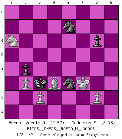 Last move : 1/2-1/2 2012 May 18 10:0:6 [Event "FICGS__CHESS__RAPID_M__000051"] [Site "FICGS"] [Date "2012.02.16"] [Round "1"] [White "Bernal Varela,Nelson"] [Black "Anderson,Peter W."] [Result "1/2-1/2"] [WhiteElo "2157"] [BlackElo "2175"] 1.e4 g6 2.d4 Bg7 3.Nf3 d6 4.Nc3 a6 5.Bc4 e6 6.O-O Ne7 7.Be3 b5 8.Bd3 Nd7 9.Qd2 Bb7 10.Bh6 O-O 11.Rfe1 c5 12.Bxg7 Kxg7 13.dxc5 dxc5 14.Rad1 Bc6 15.a4 b4 16.Ne2 Bxa4 17.b3 Bc6 18.Bc4 Qc7 19.Qg5 Ng8 20.Nf4 e5 21.Nd5 Bxd5 22.exd5 Qd6 23.Bd3 f6 24.Qg3 Nb6 25.h4 Rfd8 26.h5 e4 27.Bxe4 Qxg3 28.fxg3 f5 29.Bd3 Nxd5 30.Ng5 Nc7 31.g4 fxg4 32.hxg6 hxg6 33.Re5 c4 34.Rf1 Rf8 35.Bxc4 Rxf1+ 36.Bxf1 Re8 37.Rxe8 Nxe8 38.Bxa6 Nd6 39.Bd3 Nf5 40.Ne6+ Kf6 41.Nc5 Nge7 42.Na6 Nd5 43.Bc4 Nfe7 44.Kh2 Ke5 45.Kg3 Kd4 46.Bd3 Kc3 47.Kxg4 Ne3+ 48.Kf3 1/2-1/2 Robatsch (Modern) defense Kingside Castling by player White (move 6) Kingside Castling by player Black (move 10) This chess game ended in a draw. Follow this game move after move (download)When in doubt... play Chess ! (Tevis) Gewinnen beim Schach fördert das Selbstvertrauen. Beim Sex spüre ich sowas nicht... (Garry Kasparov) Aquel que ve no otra dirección en el juego que la de dar Jaque Mate a su oponente, nunca será un buen jugador de Ajedrez. (Euwe) La vérité est comme le meilleur coup aux échecs : elle existe, mais il faut la chercher. (Arturo Perez-Reverte) Philosophers use a language that is already deformed as though by shoes that are too tight. (Ludwig Wittgenstein)