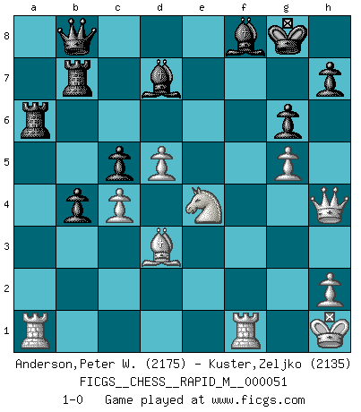 Last move : 1-0 2012 May 16 14:12:3 [Event "FICGS__CHESS__RAPID_M__000051"] [Site "FICGS"] [Date "2012.02.16"] [Round "1"] [White "Anderson,Peter W."] [Black "Kuster,Zeljko"] [Result "1-0"] [WhiteElo "2175"] [BlackElo "2135"] 1.d4 Nf6 2.c4 g6 3.Nc3 Bg7 4.e4 d6 5.Nf3 O-O 6.Be2 e5 7.Be3 c6 8.d5 Na6 9.O-O Ng4 10.Bg5 f6 11.Bh4 c5 12.Ne1 Nh6 13.f3 Nf7 14.a3 Bh6 15.Nc2 Bd7 16.Rb1 Bg5 17.Bg3 Qe7 18.b4 f5 19.exf5 Bxf5 20.Bd3 Nh6 21.Bf2 b6 22.Ne3 Bd7 23.Ne4 Bf4 24.g3 Bg5 25.Kg2 Bf6 26.Ng4 Bg7 27.Be3 Nf7 28.Qd2 Nc7 29.bxc5 dxc5 30.Ngf2 Ne8 31.a4 Ned6 32.a5 Rab8 33.Rb3 Rb7 34.Rfb1 Ba4 35.Ra3 Bd7 36.g4 Rfb8 37.Qa2 Qd8 38.Rab3 Qc8 39.Kh1 Kh8 40.Qa3 Bf8 41.axb6 axb6 42.Qb2 Bg7 43.Bh6 Bxh6 44.Nxd6 Nxd6 45.Qxe5+ Bg7 46.Qxd6 b5 47.Ne4 Bf8 48.Qg3 b4 49.Re1 Rb6 50.Ng5 R8b7 51.Qh4 Ba4 52.R3b1 Kg8 53.f4 Qd8 54.Qh3 Qf6 55.Ra1 Ra6 56.Ne4 Qxf4 57.Rf1 Qb8 58.g5 Bd7 59.Qh4 1-0 King's Indian : Gligoric-Taimanov system Kingside Castling by player Black (move 5) Kingside Castling by player White (move 9) Player White won this chess game. Follow this game move after move (download)Chess is a beautiful mistress. (Bent Larsen) Schachspieler können ausgezeichnet Varianten am Schachbrett berechnen, aber nicht im realen Leben. Zu stark ist der Individualismus im Schach ausgeprägt, und für viele ist ein kleiner momentaner persönlicher Vorteil wichtiger als ein weit größerer Vorteil von morgen. (Anatoly Karpov) No es una movida, aún la mejor movida que tu debas buscar, sino un plan comprensible. (Eugene Znosko-Borovsky) Mon pion favori sur ma case favorite ! Bronstein en parlant d'un coup de pion en h5 quand il avait les Noirs. Information on the Internet is subject to the same rules and regulations as conversation at a bar. (George Lundberg)