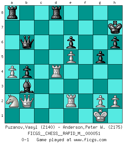 Last move : 0-1 2012 May 12 11:39:44 [Event "FICGS__CHESS__RAPID_M__000051"] [Site "FICGS"] [Date "2012.02.16"] [Round "1"] [White "Puzanov,Vasyl"] [Black "Anderson,Peter W."] [Result "0-1"] [WhiteElo "2140"] [BlackElo "2175"] 1.e4 g6 2.d4 Bg7 3.Nf3 d6 4.Nc3 Nf6 5.Be2 O-O 6.O-O e6 7.Be3 h6 8.Qd2 Kh7 9.e5 Nfd7 10.exd6 cxd6 11.Nb5 d5 12.Bf4 a6 13.Bc7 Qf6 14.Nc3 Nc6 15.Rad1 b5 16.Bd6 Re8 17.a4 b4 18.Na2 a5 19.Bb5 Na7 20.Be2 Qd8 21.c3 Nf6 22.Bf4 Ne4 23.Qc2 Qb6 24.cxb4 axb4 25.b3 Nc6 26.Bb5 Bb7 27.Rfe1 Rec8 28.Qb2 g5 29.Be3 f5 30.Ne5 f4 31.Bxc6 fxe3 32.f3 Bxc6 33.fxe4 Bxe5 34.exd5 Bxd5 35.dxe5 e2 36.Rd4 Rd8 37.Rxe2 Bxb3 0-1 Robatsch (Modern) defense Kingside Castling by player Black (move 5) Kingside Castling by player White (move 6) Player Black won this chess game. Follow this game move after move (download)Chess holds its master in its own bonds, shackling the mind and brain so that the inner freedom of the very strongest must suffer. (Albert Einstein) Die unerbitterlichsten Regeln im Schach sind die Ausnahmen. (Savielly Grigorievitsch Tartakower) Si tu oponente no puede hacer nada activo, entonces no apures la posición; En vez de eso, dejalo estar sentado ahí, sufriendo y rogandote por un empate. (Jeremy Silman) Les pièces de l'échiquier étaient impitoyables. Elles le retenaient, elles l'absorbaient. Il y avait de l'horreur en cela, mais aussi une harmonie unique. Car, qu'y a-t-il dans le monde, à part les échecs ? (V. Nabokov) Do you know these so called Volunteers don't even get paid! (Simpsons)