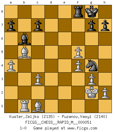 Last move : 1-0 2012 April 19 16:30:13 [Event "FICGS__CHESS__RAPID_M__000051"] [Site "FICGS"] [Date "2012.02.16"] [Round "1"] [White "Kuster,Zeljko"] [Black "Puzanov,Vasyl"] [Result "1-0"] [WhiteElo "2135"] [BlackElo "2140"] 1.c4 e5 2.g3 Nf6 3.Bg2 d5 4.cxd5 Nxd5 5.Nc3 Nxc3 6.bxc3 Be7 7.Nf3 Nc6 8.O-O O-O 9.Rb1 e4 10.Ne1 f5 11.Qc2 Be6 12.Rxb7 Qc8 13.Rb1 Qa6 14.d3 Rad8 15.dxe4 Bc4 16.Nd3 Rxd3 17.exd3 Bxd3 18.Qb3+ Bc4 19.Qb7 Bxf1 20.Bxf1 Qa4 21.Qb5 Qxb5 22.Bxb5 Ne5 23.exf5 Bc5 24.Kg2 Bb6 25.f4 Ng4 26.a4 1-0 English Opening Kingside Castling by player White (move 8) Kingside Castling by player Black (move 8) Player White won this chess game. Follow this game move after move (download)Best by test: 1. e4 (Bobby Fischer) Dein Körper muss in Topform sein. Dein Schach verfällt, wenn dein Körper verfällt. Der Körper kann nicht vom Geist getrennt werden. (Robert James Fischer) Botvinnik trató de alejar el misterio referente al Ajedrez, siempre relacionandolo a situaciones de la vida diaria. Solía llamar al Ajedrez un problema inexacto típico, similar a aquellos en que la gente tiene siempre que resolver a cada día. (Garry Kasparov) Les Echecs sont et restent toujours un combat, un combat intégral comme la boxe, la lutte ou un autre sport, et où il doit y avoir un vainqueur et un vaincu. (Joseph Emil Diemer) Pushing plastic is for the many, pushing virtual pieces is for the fewer, pushing wood is for the very few. (Normajean Yates)