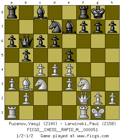 Last move : 1/2-1/2 2012 April 1 23:39:33 [Event "FICGS__CHESS__RAPID_M__000051"] [Site "FICGS"] [Date "2012.02.16"] [Round "1"] [White "Puzanov,Vasyl"] [Black "Larwinski,Paul"] [Result "1/2-1/2"] [WhiteElo "2140"] [BlackElo "2158"] 1.e4 e5 2.Nf3 Nc6 3.Bb5 a6 4.Ba4 Nf6 5.d3 d6 6.O-O Be7 7.c4 O-O 8.Be3 Ng4 9.Nc3 Nxe3 10.fxe3 Nb8 11.d4 c6 12.Bb3 Nd7 13.Qe1 b5 14.a3 Qb6 15.Qf2 1/2-1/2 Ruy Lopez : Anderssen variation Kingside Castling by player White (move 6) Kingside Castling by player Black (move 7) This chess game ended in a draw. Follow this game move after move (download)A thorough understanding of the typical mating continuations makes the most complicated sacrificial combinations leading up to them not only not difficult, but almost a matter of course. (Siegbert Tarrasch) Ich hatte Zahnschmerzen im ersten Spiel. In der zweiten Partie tat mir der Kopf weh. In der dritten war es eine Rheuma-Attacke und während der vierten fühlte ich mich nicht gut. Und in der fünften? Nun, man muss doch nicht jedes Spiel gewinnen, oder? (Savielly Grigorievitsch Tartakower) Me siento como si fuera una pieza en una partida de Ajedrez, cuando mi oponente me indica: esa pieza no puede ser movida. (Soren Kierkegaard) Le génie consiste à savoir transgresser les règles au moment opportun. (Teichmann) Employ the attack like tactic of defense. (Chinese proverb)