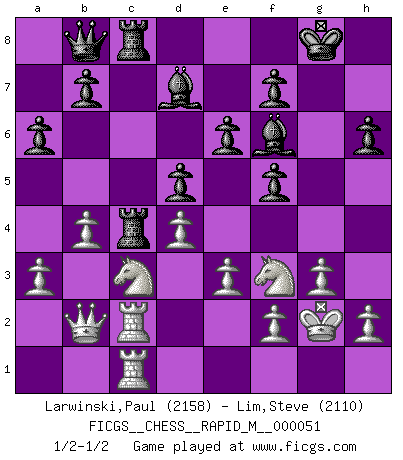 Last move : 1/2-1/2 2012 March 19 16:47:20 [Event "FICGS__CHESS__RAPID_M__000051"] [Site "FICGS"] [Date "2012.02.16"] [Round "1"] [White "Larwinski,Paul"] [Black "Lim,Steve"] [Result "1/2-1/2"] [WhiteElo "2158"] [BlackElo "2110"] 1.d4 d5 2.c4 e6 3.Nc3 Nf6 4.Bg5 Be7 5.e3 O-O 6.Rc1 h6 7.Bxf6 Bxf6 8.Nf3 c6 9.cxd5 cxd5 10.Bd3 Nc6 11.O-O Bd7 12.a3 Rc8 13.b4 a6 14.Qb3 Rc7 15.Rfd1 Ne7 16.Rc2 Qb8 17.Rdc1 Rfc8 18.Qb2 g6 19.g3 Nf5 20.Bxf5 gxf5 21.Kg2 Rc4 1/2-1/2 QGD : Anti-neo-Orthodox variation Kingside Castling by player Black (move 5) Kingside Castling by player White (move 11) This chess game ended in a draw. Follow this game move after move (download)I know people who have all the will in the world, but still can't play good Chess. (Bobby Fischer) Ich habe die besten Aussichten, den ersten Preis zu gewinnen - denn jeder muss gegen Steinitz spielen, nur ich nicht! (Wilhelm Steinitz) Yo tuve un dolor de muelas en la primer partida. En el segundo juego, tuve un dolor de cabeza. En el tercero, tuve un ataque de reumatísmo. En la cuarta partida, no me sentía muy bien. ¿Y en el quinto juego? Bueno, ¿que acaso uno tiene que ganar todos los juegos?. (Siegbert Tarrasch) On n'a jamais que l'âge auquel on a commence à jouer aux échecs car après on cesse de vieillir. (Capablanca) In my experience, there's no such thing as luck. (Obi-Wan Kenobi in Star Wars ep.4)