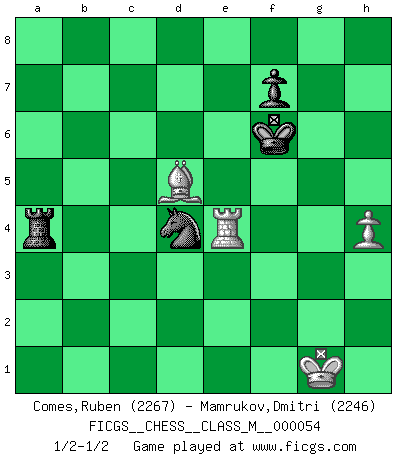 Last move : 1/2-1/2 2012 December 18 19:40:0 [Event "FICGS__CHESS__CLASS_M__000054"] [Site "FICGS"] [Date "2012.02.16"] [Round "1"] [White "Comes,Ruben"] [Black "Mamrukov,Dmitri"] [Result "1/2-1/2"] [WhiteElo "2267"] [BlackElo "2246"] 1.e4 c5 2.Nf3 e6 3.d4 cxd4 4.Nxd4 a6 5.Bd3 Bc5 6.Nb3 Be7 7.Qg4 g6 8.Qg3 d6 9.Nc3 Nd7 10.a4 b6 11.O-O h5 12.h3 h4 13.Qe3 Bb7 14.Qd4 Ngf6 15.Bg5 Kf8 16.Rad1 Kg7 17.f4 Nc5 18.Rf2 Rc8 19.Nxc5 bxc5 20.Qe3 c4 21.Bf1 d5 22.Rd4 Ng8 23.Bxe7 Nxe7 24.f5 gxf5 25.Qg5+ Ng6 26.Qxd8 Rcxd8 27.exd5 Bxd5 28.Rfd2 Ne7 29.Nxd5 Rxd5 30.Bxc4 Rxd4 31.Rxd4 a5 32.c3 Rb8 33.Bb5 e5 34.Rxh4 f4 35.g3 fxg3 36.Rg4+ Kf6 37.Rxg3 e4 38.h4 Rd8 39.b4 Nf5 40.Rg4 axb4 41.cxb4 Rd4 42.Bc6 Rxb4 43.Rxe4 Nd4 44.Bd5 Rxa4 1/2-1/2 Sicilian : Kan, Polugaievsky variation Kingside Castling by player White (move 11) 10 pieces endgame at move 42 : White KRBPP , Black KRNPP WHITE : King + 1 Rook 1 Bishop 2 Pawns BLACK : King + 1 Rook 1 Knight 2 Pawns 9 pieces endgame at move 43 : White KRBPP , Black KRNP WHITE : King + 1 Rook 1 Bishop 2 Pawns BLACK : King + 1 Rook 1 Knight 1 Pawn 8 pieces endgame at move 44 : White KRBP , Black KRNP WHITE : King + 1 Rook 1 Bishop 1 Pawn BLACK : King + 1 Rook 1 Knight 1 Pawn This chess game ended in a draw. Follow this game move after move (download)A Chess game is a dialogue, a conversation between a player and his opponent. Each move by the opponent may contain threats or be a blunder, but a player cannot defend against threats or take advantage of blunders if he does not first ask himself: What is my opponent planning after each move ? (Bruce A. Moon) Aljechin war kein Nazi. Er war ein Opportunist. Ein schrecklicher Mann. Er liebte Geld über alles und würde für Geld ein Jude, ein Katolik oder ein Protestant werden. (Miguel Najdorf) Las piezas de Ajedrez son los bloques del alfabeto que moldean los pensamientos; y esos pensamientos, aunque hagan un diseño visual en el tablero, expresan abstractamente su belleza como un poema. (Marcel Duchamp) Les échecs sont un jeu terrible. Si vous n'avez pas le centre, votre adversaire a une position plus libre. Par contre, si vous avez le centre, alors vous avez vraiment quelque chose pour laquelle vous inquiéter ! (Siegbert Tarrasch) All the troubles of the world come from being unable to sit alone in a quiet room. (Blaise Pascal)