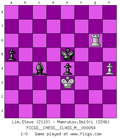 Last move : 1-0 2013 March 29 5:17:53 [Event "FICGS__CHESS__CLASS_M__000054"] [Site "FICGS"] [Date "2012.02.16"] [Round "1"] [White "Lim,Steve"] [Black "Mamrukov,Dmitri"] [Result "1-0"] [WhiteElo "2110"] [BlackElo "2246"] 1.e4 c5 2.Nf3 e6 3.d4 cxd4 4.Nxd4 a6 5.Bd3 Bc5 6.Nb3 Be7 7.O-O d6 8.Qg4 g6 9.Qe2 Nd7 10.Nc3 Qc7 11.Be3 b6 12.a4 Bb7 13.Rad1 h5 14.h3 Ngf6 15.f4 h4 16.Bd4 e5 17.fxe5 dxe5 18.Be3 Nh5 19.Bc4 Ndf6 20.Bd5 Nxd5 21.exd5 f5 22.Qf2 Rc8 23.Rfe1 Qd6 24.Bxb6 O-O 25.a5 Nf4 26.Be3 Nxd5 27.Rd2 f4 28.Bb6 Rf5 29.Qf3 Rxc3 30.bxc3 Qc6 31.Rde2 Bd6 32.c4 Qxc4 33.Nd2 Qc6 34.c4 Ne3 35.Qxc6 Bxc6 36.Bxe3 fxe3 37.Nf1 Bc5 38.Kh1 e4 39.Nxe3 Bxe3 40.Rxe3 Rxa5 41.g3 hxg3 42.Rxg3 Rc5 43.Rc1 Kf7 44.Kg2 Bd7 45.Kf2 Be6 46.Rgc3 Kf6 47.Ke3 Ke5 48.h4 a5 49.Rg1 Rxc4 50.Rxc4 Bxc4 51.Rxg6 1-0 Sicilian : Kan, Polugaievsky variation Kingside Castling by player White (move 7) Kingside Castling by player Black (move 24) 10 pieces endgame at move 49 : White KRRP , Black KRBPPP WHITE : King + 2 Rooks 1 Pawn BLACK : King + 1 Rook 1 Bishop 3 Pawns 9 pieces endgame at move 50 : White KRRP , Black KBPPP WHITE : King + 2 Rooks 1 Pawn BLACK : King + 1 Bishop 3 Pawns 8 pieces endgame at move 50 : White KRP , Black KBPPP WHITE : King + 1 Rook 1 Pawn BLACK : King + 1 Bishop 3 Pawns 7 pieces endgame at move 51 : White KRP , Black KBPP WHITE : King + 1 Rook 1 Pawn BLACK : King + 1 Bishop 2 Pawns Player White won this chess game. Follow this game move after move (download)Blessed be the memory of him who gave the world this immortal game. (A. G. Gardiner) Offensichtlich kennt Kasparow nichts anderes als Schach, und ich könnte 500 weitere Spieler dieser Sorte benennen. (Judith Polgar) Con o sin el título, Bobby Fischer fue sin lugar a dudas el mas grande jugador de su época. (Burt Hochberg) Si je n'étais pas joueur d'échecs, je serais le meilleur dans quelque chose d'autre. (Anatoli Karpov) God, you are such an idiot. - Actually, I thought I was more of a jerk. (Gregory House to Stacy Warner, House M.D.)