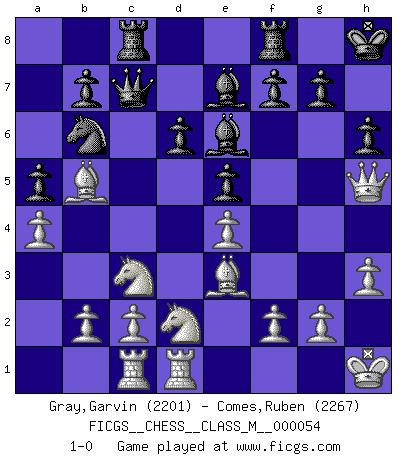 Last move : 1-0 2012 November 18 21:22:30 [Event "FICGS__CHESS__CLASS_M__000054"] [Site "FICGS"] [Date "2012.02.16"] [Round "1"] [White "Gray,Garvin"] [Black "Comes,Ruben"] [Result "1-0"] [WhiteElo "2201"] [BlackElo "2267"] 1.e4 c5 2.Nf3 d6 3.d4 cxd4 4.Nxd4 Nf6 5.Nc3 a6 6.Be2 e5 7.Nb3 Be7 8.Qd3 O-O 9.O-O Be6 10.Be3 Qc8 11.Rac1 a5 12.Rfd1 Nbd7 13.a4 Ng4 14.Bd2 Nb6 15.Ra1 Nf6 16.Bg5 Nbd7 17.Qg3 Kh8 18.Be3 Qc6 19.Bb5 Qc7 20.h3 Rg8 21.Bd3 Qc6 22.Bb5 Qc7 23.Bd3 Qc6 24.Rab1 Nb6 25.Bb5 Qc7 26.Nd2 Rac8 27.Be2 Qd8 28.Bb5 Rf8 29.Kh1 h6 30.Rbc1 Nh5 31.Qf3 Qc7 32.Qxh5 1-0 Sicilian : Najdorf, Opovcensky variation Kingside Castling by player Black (move 8) Kingside Castling by player White (move 9) Player White won this chess game. Follow this game move after move (download)What is the object of playing a gambit opening?... To acquire a reputation of being a dashing player at the cost of losing a game. (Siegbert Tarrasch) Es liegt in der Natur, vernüftig zu denken und unlogisch zu handeln. (Anatole France) El Ajedrez es un invernadero donde los frutos del carácter pueden madurar mas completamente que en la vida. (Edward Morgan Foster) La tactique est l'élément le plus important du milieu de jeu. (Siegbert Tarrasch) All battles are fought by scared men who'd rather be someplace else. (John Wayne in the movie In harm's way)