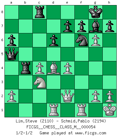 Last move : 1/2-1/2 2012 September 14 9:20:55 [Event "FICGS__CHESS__CLASS_M__000054"] [Site "FICGS"] [Date "2012.02.16"] [Round "1"] [White "Lim,Steve"] [Black "Schmid,Pablo"] [Result "1/2-1/2"] [WhiteElo "2110"] [BlackElo "2194"] 1.e4 c5 2.Nf3 Nc6 3.d4 cxd4 4.Nxd4 g6 5.c4 Nf6 6.Nc3 d6 7.Be2 Nxd4 8.Qxd4 Bg7 9.Be3 O-O 10.Qd2 Be6 11.O-O Qa5 12.b3 Rfc8 13.Rad1 a6 14.f4 b5 15.f5 Bd7 16.Bd4 bxc4 17.Bxc4 Bb5 18.Qe2 Bxc4 19.bxc4 Rab8 20.Kh1 Rb4 21.fxg6 1/2-1/2 Sicilian : Accelerated Fianchetto, Maroczy bind Kingside Castling by player Black (move 9) Kingside Castling by player White (move 11) This chess game ended in a draw. Follow this game move after move (download)The sign of a great Master is his ability to win a won game quickly and painlessly. (Irving Chernev) Über Karpov: Er war und ist ein Vertreter der russischen Reaktionäre. Das steckt tief in seiner Seele, wehalb ich nicht nett mit ihm umgehen kann. (Viktor Kortschnoi) ¿Se han dado cuenta de que Fischer casi nunca ha tenido piezas malas? El las intercambia y las piezas malas se quedan con sus oponenets. (Yuri Balashov) Les échecs sont un jeu par leur forme, un art par leur essence et une science par sa difficulté d'acquisition. Ils peuvent vous procurer autant de plaisir qu'un bon livre ou une belle musique, mais vous n'aurez une réelle joie que si vous arrivez à bien jouer. (Tigran Petrosian) The man who strikes first admits that his ideas have given out. (Chinese proverb)