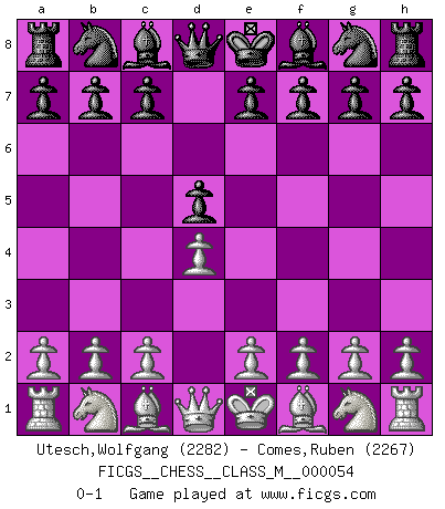Last move : 0-1 2012 March 28 10:40:11 [Event "FICGS__CHESS__CLASS_M__000054"] [Site "FICGS"] [Date "2012.02.16"] [Round "1"] [White "Utesch,Wolfgang"] [Black "Comes,Ruben"] [Result "0-1"] [WhiteElo "2282"] [BlackElo "2267"] 1.d4 d5 0-1 This chess game has been lost on time (started : 2012.02.16 11:0:4) Queen's pawn game Player Black won this chess game. Follow this game move after move (download)In Chess, at least, the brave inherit the earth. (Edmar Mednis) Man gibt nur Pakete auf. (Paul Keres) Una buena ofensiva y una buena defensa, comienzan ambas con un buen desarrollo. (Bruce A. Moon) Le génie consiste à savoir transgresser les règles au moment opportun. (Teichmann) Perception is reality. (Immanuel Kant)