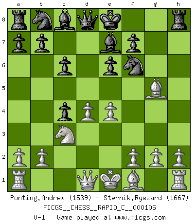 Last move : 0-1 2012 March 31 10:49:22 [Event "FICGS__CHESS__RAPID_C__000105"] [Site "FICGS"] [Date "2012.02.17"] [Round "1"] [White "Ponting,Andrew"] [Black "Sternik,Ryszard"] [Result "0-1"] [WhiteElo "1539"] [BlackElo "1667"] 1.d4 d5 2.c4 c6 3.Nf3 Nf6 4.Nc3 e6 5.Bg5 h6 6.Bh4 dxc4 7.e4 g5 8.Nxg5 hxg5 9.Bxg5 Be7 0-1 This chess game has been lost on time (started : 2012.02.17 19:27:5) QGD Slav : 4.Nc3 Player Black won this chess game. Follow this game move after move (download)When you are lonely, when you feel yourself an alien in the world, play Chess. This will raise your spirits and be your counselor in war. (Aristotle) Sie führen leise Selbstgespräche, schlürfen lautstark ihre Getränke, schmatzen hörbar beim Essen, blasen ihrem Gegenüber Rauch in die Augen, niesen ihm ins Gesicht, starren ihn unverwandt an, bis er sich unter ihren Blicken windet, rutschen ständig auf ihrem Stuhl hin und her, rülpsen und bohren in der Nase. (Anonymous) La partida mas dura de ganar es una partida ganada. (Emanuel Lasker) Les Echecs mettent en conflit, non pas deux intelligences, mais deux volontés. (Lasker) If computers get too powerful, we can organize them into committees. That'll do them in. (Anonymous)