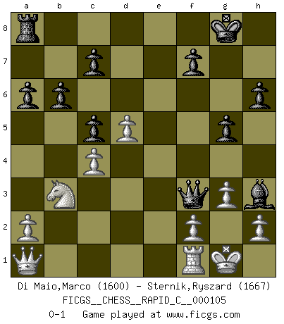Last move : 0-1 2012 February 24 22:50:54 [Event "FICGS__CHESS__RAPID_C__000105"] [Site "FICGS"] [Date "2012.02.17"] [Round "1"] [White "Di Maio,Marco"] [Black "Sternik,Ryszard"] [Result "0-1"] [WhiteElo "1600"] [BlackElo "1667"] 1.e4 e5 2.Nf3 Nc6 3.Bb5 a6 4.Bxc6 dxc6 5.d4 exd4 6.Nxd4 Nf6 7.Bg5 h6 8.Bxf6 Qxf6 9.O-O Bd6 10.g3 O-O 11.Nc3 Rd8 12.Nce2 c5 13.Nb3 Be5 14.Qc1 Bxb2 15.Qe1 Bxa1 16.Qxa1 Qf3 17.Nf4 b6 18.c4 g5 19.Nd5 Rxd5 20.exd5 Bh3 0-1 Ruy Lopez : Exchange variation Kingside Castling by player White (move 9) Kingside Castling by player Black (move 10) Player Black won this chess game. Follow this game move after move (download)In Chess, just as in life, today's bliss may be tomorrow's poison. (Assaic) Wie gewinnt Tal? Er entwickelt alle seine Figuren in die Brettmitte und opfert sie dann irgendwo. (Robert James Fischer) En un gambito tu regalas un Peón por el bién de tomar un juego perdido. (Samuel Standige Boden) Celui qui prend des risques peut perdre, celui qui n'en prend pas perd toujours. (Xavier Tartacover) Whenever people agree with me, I always feel I must be wrong. (Oscar Wilde)
