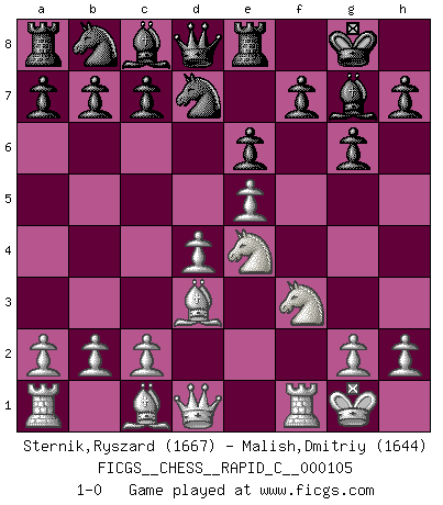 Last move : 1-0 2012 April 3 11:1:7 [Event "FICGS__CHESS__RAPID_C__000105"] [Site "FICGS"] [Date "2012.02.17"] [Round "1"] [White "Sternik,Ryszard"] [Black "Malish,Dmitriy"] [Result "1-0"] [WhiteElo "1667"] [BlackElo "1644"] 1.e4 d6 2.d4 Nf6 3.Nc3 g6 4.f4 Bg7 5.Nf3 O-O 6.Bd3 e6 7.O-O Re8 8.e5 dxe5 9.fxe5 Nfd7 10.Ne4 1-0 This chess game has been lost on time (started : 2012.02.17 19:27:5) Pirc : Austrian attack, 6.Bd3 Kingside Castling by player Black (move 5) Kingside Castling by player White (move 7) Player White won this chess game. Follow this game move after move (download)Chess is the gymnasium of the mind. (Blaise Pascal) Obwohl ich vom Stil her kaum zu den Priestern der Schachkunst gezählt werde, halte ich Schach doch für eine Kunst. (Tigran Petrosjan) Nunca nadie ha ganado una partida de Ajedrez rindiendose. (Unknown) La solitude du joueur d'Echecs à l'approche du mat est semblable à celle du condamné. (Francis Szpiner) Creativity is allowing yourself to make mistakes. Art is knowing which ones to keep. (Scott Adams)