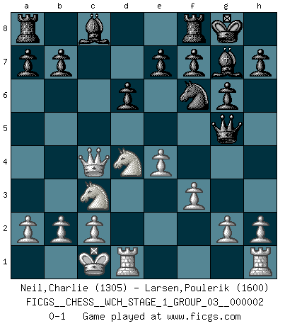 Last move : 0-1 2007 March 3 14:26:23 [Event "FICGS__CHESS__WCH_STAGE_1_GROUP_03__000002"] [Site "FICGS"] [Date "2007.01.16"] [Round "1"] [White "Neil,Charlie"] [Black "Larsen,Poulerik"] [Result "0-1"] [WhiteElo "1305"] [BlackElo "1600"] 1.e4 c5 2.Nc3 d6 3.Nge2 Nf6 4.d4 cxd4 5.Nxd4 g6 6.Bc4 Bg7 7.f3 O-O 8.Bg5 Nbd7 9.Qd2 Ne5 10.O-O-O Nxc4 11.Qe2 Qa5 12.Qxc4 Qxg5+ 0-1 Sicilian : Closed Kingside Castling by player Black (move 7) Queenside Castling by player White (move 10) Player Black won this chess game. Follow this game move after move (download)Morphy was probably the greatest genius of them all. (Bobby Fischer) Das Schachspiel übertrifft alle anderen Spiele so weit wie der Chimborasso einen Misthaufen. (Arthur Schopenhauer) No volvere nunca a jugar contigo. Has insultado a mi amigo. - cuando un oponente se maldijo por una mala jugada (Miguel Najdorf) Le jeu d'échecs fait naître et fortifie en nous plusieurs qualités précieuses dans le cours de l'existence, telles que la prévoyance, la circonspection, la prudence, et la persévérance. (Benjamin Franklin - 1783, la morale des échecs) You have to believe in yourself. (Sun Tzu)