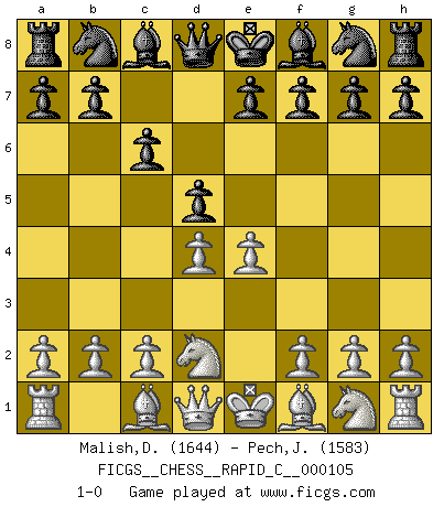 Last move : 1-0 2012 April 29 12:23:48 [Event "FICGS__CHESS__RAPID_C__000105"] [Site "FICGS"] [Date "2012.02.17"] [Round "1"] [White "Malish,Dmitriy"] [Black "Pech,Jaroslav senior"] [Result "1-0"] [WhiteElo "1644"] [BlackElo "1583"] 1.e4 c6 2.d4 d5 3.Nd2 1-0 This chess game has been lost on time (started : 2012.02.17 19:27:5) Caro-Kann : 3.Nd2 Player White won this chess game. Follow this game move after move (download)I thought the most common mistake [in chess] was the first one: Learning the game :P (Garvin Gray, FICGS forum) Capablanka war das größte Genie der Schachgeschichte! Aber denken sie nicht er habe nichts vom Schach verstanden. Er wusste nur soviel wie er wissen musste um seine Ziele zu erreichen. (Mikhail Moiseyevich Botvinik) Tu cuerpo tiene que estar en óptima condición. Tu Ajedrez se deteriora como lo hace tu cuerpo. No puedes separar la mente y el cuerpo. (Bobby Fischer) La menace est plus forte que l'exécution. (Aaron Nimzovitch) Macintosh - we might not get everything right, but at least we knew the century was going to end. (Douglas Adams)
