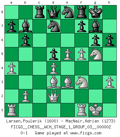 Last move : 0-1 2007 March 12 19:24:38 [Event "FICGS__CHESS__WCH_STAGE_1_GROUP_03__000002"] [Site "FICGS"] [Date "2007.01.16"] [Round "1"] [White "Larsen,Poulerik"] [Black "MacNair,Adrian"] [Result "0-1"] [WhiteElo "1600"] [BlackElo "1273"] 1.e4 g6 2.d4 Bg7 3.Nc3 d6 4.f4 Nf6 5.Nf3 O-O 6.Be3 Nbd7 7.Qd2 c6 8.h3 Qc7 9.a4 e6 10.Bd3 b6 11.O-O Bb7 12.e5 Ne8 13.Ne4 c5 14.c3 d5 15.Neg5 cxd4 16.cxd4 Rc8 17.g4 Qd8 18.f5 exf5 19.gxf5 h6 0-1 This chess game has been lost on time (started : 2007.01.16 15:13:54) Robatsch defense : Pseudo-Austrian attack Kingside Castling by player Black (move 5) Kingside Castling by player White (move 11) Player Black won this chess game. Follow this game move after move (download)It is not a move, even the best move that you must seek, but a realizable plan. (Eugene Znosko-Borovsky) Ich bin stolz ein Bulgare zu sein. (Veselin Topalov) Una buena memoria, concentración, imaginación y una fuerte voluntad, se requiere para llegar a ser un buen jugador. (Bobby Fischer) La menace est plus forte que l'exécution. (Aaron Nimzovitch) Unless in communicating with it one says exactly what one means, trouble is bound to result. (Alan Turing, about computers)