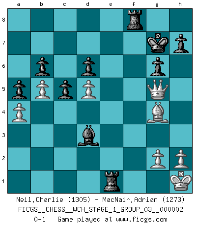 Last move : 0-1 2007 March 1 18:52:29 [Event "FICGS__CHESS__WCH_STAGE_1_GROUP_03__000002"] [Site "FICGS"] [Date "2007.01.16"] [Round "1"] [White "Neil,Charlie"] [Black "MacNair,Adrian"] [Result "0-1"] [WhiteElo "1305"] [BlackElo "1273"] 1.e4 g6 2.d4 Bg7 3.c4 d6 4.Nc3 Nf6 5.Be2 O-O 6.Nf3 Nbd7 7.Be3 c6 8.O-O Qc7 9.b4 b6 10.b5 c5 11.Qd2 Bb7 12.d5 Ng4 13.Bf4 Nde5 14.Nxe5 Nxe5 15.Bh6 Bc8 16.Bxg7 Kxg7 17.a4 a5 18.Nd1 f5 19.exf5 Bxf5 20.Ne3 Qd7 21.Rfe1 Rae8 22.Nf1 e6 23.Qg5 exd5 24.cxd5 Qf7 25.Ne3 Bd3 26.Ng4 Nxg4 27.Bxg4 Qxf2+ 28.Kh1 Qxe1+ 29.Rxe1 Rxe1+ 0-1 Robatsch (Modern) defense Kingside Castling by player Black (move 5) Kingside Castling by player White (move 8) Player Black won this chess game. Follow this game move after move (download)You know you're going to lose. Even when I was ahead I knew I was going to lose. - On playing against Fischer. (Andrew Soltis) Warum muß ich gegen diesen IDIOTEN verlieren? (Aaron Nimzowitsch) Yo no creo en la psicología. Yo creo en las buenas movidas. (Bobby Fischer) Vous m'avez demandé de vous exposer quel est le fondement de la prière. Je ne fais que préparer les pièces du jeu sur la table... Nous sera-t-il permis d'en adopter les règles et si nous les appliquons scrupuleusement nous ne tarderons pas à faire mat le Roi divin ! Il ne pourra échapper à nos mains. (Sainte Thérèse d'Avila, Chemin de perfection) The production of too many useful things results in too many useless people. (Karl Marx)