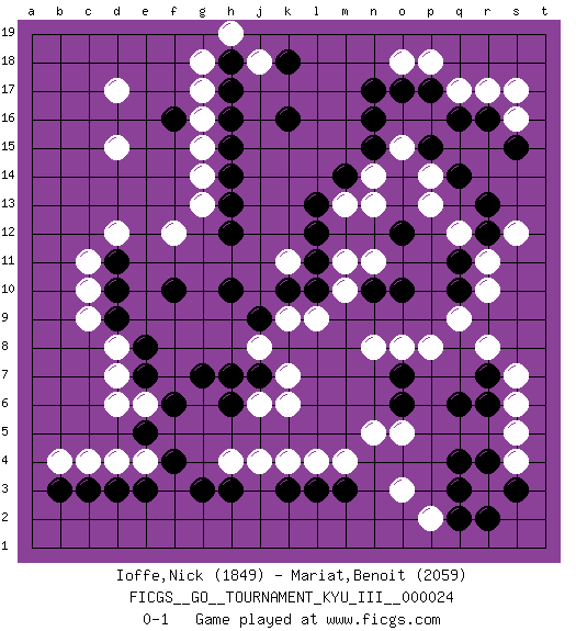 Last move : 0-1 2012 April 23 22:18:33 [Event "FICGS__GO__TOURNAMENT_KYU_III__000024"] [Site "FICGS"] [Date "2012.02.21"] [Round "1"] [Black "Ioffe,Nick"] [White "Mariat,Benoit"] [Result "0-1"] [Rating 1 "1849"] [Rating 2 "2059"] 1.q16 d4 2.q4 d17 3.q10 c11 4.k16 o3 5.m3 o5 6.q6 l4 7.l3 k4 8.k3 j4 9.h3 h4 10.g3 m4 11.c3 c4 12.d3 e4 13.e3 k11 14.f10 f12 15.f16 d15 16.h10 k9 17.g7 d8 18.e8 d7 19.d9 c9 20.d10 c10 21.j7 k7 22.h12 g13 23.h13 g14 24.h14 g15 25.h15 g16 26.h16 g17 27.h17 r17 28.r16 q17 29.p17 p18 30.o17 o18 31.n17 s16 32.s15 s17 33.q14 r8 34.r7 p8 35.n10 n8 36.l12 m11 37.l11 m10 38.l10 n11 39.o10 l9 40.k10 r10 41.q11 r11 42.r12 q9 43.j9 r3 44.q3 s5 45.r4 s4 46.r2 s7 47.s3 p2 48.q2 n13 49.f4 b4 50.b3 s12 51.r13 g18 52.d11 d12 53.e7 e6 54.f6 j6 55.e5 d6 56.h6 j8 57.h7 k6 58.o6 n5 59.o7 o8 60.r6 s6 61.m14 m13 62.l13 j18 63.h18 h19 64.k18 n14 65.n15 o15 66.n16 p14 67.p15 p13 68.o12 q12 0-1 Here are the names of the openings (joseki) played in the four corners : Corner q4 : q4 o3 Hoshi (Hwajeom, Seongjeom, Xingwei`) 4-4 Point. The star or hoshi (4-4) point, emphasizing influence at the potential expense of territory. Ikken Kakari (Hankan Keolch'im, Yi Gua`jiao~, 1-Space Low Approach). White 2 is the standard approach move to the 4-4. Corner q16 : q16 r17 Hoshi (Hwajeom, Seongjeom, Xingwei`) 4-4 Point. The star or hoshi (4-4) point, emphasizing influence at the potential expense of territory. Player White won this Go (weiqi, baduk) game. Follow this game move after move (download)Don't overlook the edge of the board. (Anonymous) Perseverance does not equal worthiness. Next time you want to get my attention, wear something fun. Low-riding jeans are hot. (Gregory House, House M.D.)