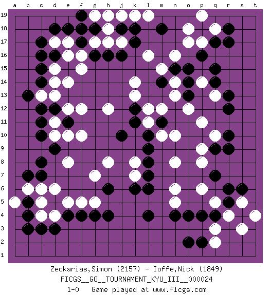 Last move : 1-0 2012 April 5 14:11:15 [Event "FICGS__GO__TOURNAMENT_KYU_III__000024"] [Site "FICGS"] [Date "2012.02.21"] [Round "1"] [Black "Zeckarias,Simon"] [White "Ioffe,Nick"] [Result "1-0"] [Rating 1 "2157"] [Rating 2 "1849"] 1.q15 d15 2.r5 c4 3.e4 d6 4.c3 d4 5.d3 e5 6.f4 f5 7.g4 g5 8.h4 l16 9.c17 e17 10.d16 e16 11.c15 d14 12.c14 d13 13.c12 p17 14.r17 q3 15.o4 q5 16.q4 r4 17.p4 s5 18.r6 s3 19.p2 p6 20.s6 t4 21.r9 p8 22.q7 n6 23.l4 q2 24.r12 q10 25.r10 p11 26.o15 n16 27.m14 k14 28.l6 k7 29.l7 k8 30.l8 n10 31.l9 l11 32.m11 m10 33.l10 m12 34.k11 l12 35.j10 h12 36.d12 e12 37.e11 f12 38.c8 e8 39.c10 h8 40.k6 f10 41.p18 q18 42.q17 o18 43.p16 o17 44.r18 p19 45.o2 p14 46.q14 q13 47.r13 n14 48.n15 m15 49.o14 n13 50.o13 o12 51.b4 b6 52.b5 c5 53.c7 c6 54.h6 g7 55.k12 k13 56.d18 d17 57.c16 c13 58.b13 d11 59.c11 d10 60.e18 f18 61.g18 g17 62.f19 h18 63.f17 f16 64.f18 h17 65.d9 e10 66.b7 a5 67.b3 n5 68.n4 n8 69.q9 p9 70.h19 j19 71.j18 g19 72.e15 f15 73.h19 k19 74.k18 g19 75.g16 j17 76.h19 l19 77.k17 e14 78.j16 g19 79.h16 h19 80.m18 1-0 Here are the names of the openings (joseki) played in the four corners : Corner d4 : c4 e4 Komoku (Somok, Xiao~mu`) 3-4 Point. The komoku (3-4) point is the traditional corner enclosure move.. Ikken Takagakari (Hankan Nop'dakeolch'im, Yi Gaogua`jiao~, 1-Space High Approach). The 5-4 approach move has become more popular in modern times, as modern Go emphasizes speed and influence. Corner q16 : q15 l16 Takamoku (Gomok, Gaomu`) 5-4 Point. The takamoku (high) point (5-4). With its emphasis on influence, the 5-4 point complements the 4-4 (hoshi) point in creating an influence-oriented fuseki. Corner d16 : d15 c17 Takamoku (Gomok, Gaomu`) 5-4 Point. The takamoku (high) point (5-4). With its emphasis on influence, the 5-4 point complements the 4-4 (hoshi) point in creating an influence-oriented fuseki. San-san. Black plays the 3-3 when White has a stone at top such as marked. Corner q4 : r5 q3 Mokuhazushi (Waemok, Wai`mu`) 5-3 Point. The mokuhazushi (5-3) point was popular in the Edo period in Japan (1600 - 1867). It emphasizes influence; territorially, it is inferior to the 3-4 point. Komoku Kakari. White 2 is the standard approach because of its solidity and stability. Player Black won this Go (weiqi, baduk) game. Follow this game move after move (download)Conservative and slow will win. Believe it ! (Anonymous) If everyone is thinking alike, then somebody isn't thinking. (US General George S. Patton)