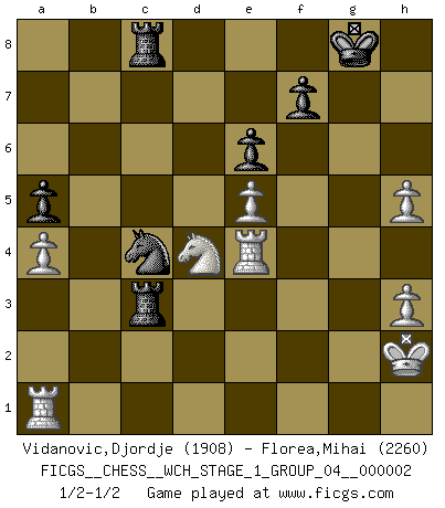 Last move : 1/2-1/2 2007 March 22 22:57:27 [Event "FICGS__CHESS__WCH_STAGE_1_GROUP_04__000002"] [Site "FICGS"] [Date "2007.01.16"] [Round "1"] [White "Vidanovic,Djordje"] [Black "Florea,Mihai"] [Result "1/2-1/2"] [WhiteElo "1908"] [BlackElo "2260"] 1.e4 c5 2.Nf3 Nc6 3.a4 g6 4.d4 cxd4 5.Nxd4 Bg7 6.Nxc6 bxc6 7.Nc3 d6 8.Be2 Nf6 9.O-O O-O 10.Rb1 Qc7 11.Bg5 Rb8 12.b4 a5 13.b5 Be6 14.Qd2 Rfc8 15.Bd3 Ng4 16.bxc6 h6 17.Bf4 Qxc6 18.Nb5 Qc5 19.h3 Ne5 20.Bxh6 Bxh6 21.Qxh6 Ba2 22.Ra1 Bc4 23.Bxc4 Nxc4 24.Rfe1 Qe5 25.f4 Qc5+ 26.Kh1 Qh5 27.Qxh5 gxh5 28.g3 Nb6 29.Nd4 Nc4 30.e5 dxe5 31.fxe5 e6 32.Re4 Rb2 33.g4 Rc5 34.Nb3 Rc8 35.gxh5 Rxc2 36.Nd4 Rc3 37.Kh2 1/2-1/2 Sicilian defense Kingside Castling by player White (move 9) Kingside Castling by player Black (move 9) This chess game ended in a draw. Follow this game move after move (download)Castle early and often. (Rob Sillars) Es ist nicht das erste mal, dass sich die FIDE dem Arabischen Geld gebeugt hat (über die FIDE WM 2004 in Lybien). (Larry Evans) Por esta medida (el intervalo entre Fischer y sus contemporaneos), yo le considero el mas grande campeón mundial. (Garry Kasparov) Il a essayé de se convaincre qu'il pourrait empêcher toutes les erreurs et ne jamais perdre. L'horreur ! Gary Kasparov au sujet de Robert Fischer. The only thing that matters is the evidence. (Horatio Caine, C.S.I. Miami)
