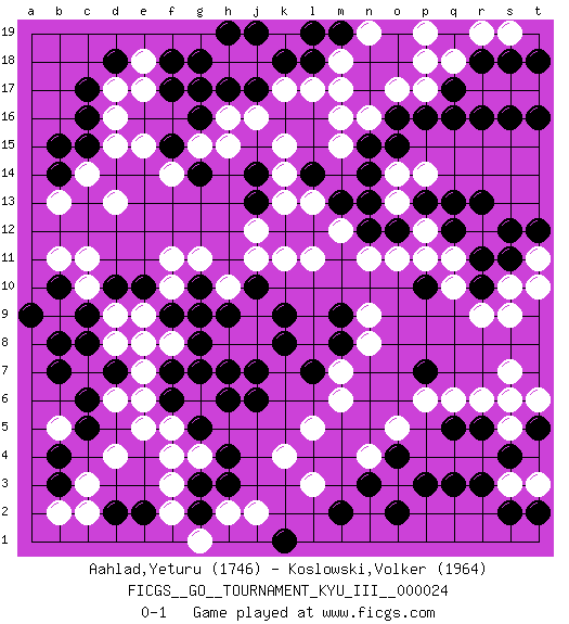 Last move : 0-1 2013 April 11 23:21:49 [Event "FICGS__GO__TOURNAMENT_KYU_III__000024"] [Site "FICGS"] [Date "2012.02.21"] [Round "1"] [Black "Aahlad,Yeturu"] [White "Koslowski,Volker"] [Result "0-1"] [Rating 1 "1746"] [Rating 2 "1964"] 1.q16 d4 2.q3 d16 3.r5 l3 4.c6 f4 5.b4 c3 6.c9 o3 7.f17 c14 8.d18 c11 9.r10 g11 10.n17 j11 11.j14 l13 12.k12 b5 13.c5 k13 14.j13 j12 15.l12 m12 16.m13 l11 17.l14 k11 18.j17 k14 19.n14 k15 20.p7 k17 21.k18 j16 22.h17 m6 23.f6 e6 24.f7 e7 25.e8 e5 26.f9 c7 27.d7 d8 28.c8 d9 29.d10 d6 30.b7 e9 31.e10 f8 32.g8 c10 33.g10 f11 34.j6 b9 35.d7 e8 36.b3 f10 37.g9 j8 38.j7 l5 39.l7 m7 40.k8 j9 41.m8 n8 42.m9 n9 43.g5 b2 44.b8 h8 45.h7 p6 46.h3 r6 47.q5 q6 48.n12 n11 49.o12 q10 50.p10 q11 51.q12 p11 52.r11 p12 53.p13 o11 54.r13 o13 55.n13 e17 56.c17 e18 57.c16 d15 58.b15 l17 59.l18 o14 60.n15 s5 61.s4 p14 62.q13 n16 63.o16 s7 64.e2 s3 65.t5 s6 66.r3 t6 67.s2 m16 68.g14 m18 69.n18 m17 70.m19 o17 71.o18 p17 72.p16 n19 73.l19 p18 74.r18 g4 75.h4 g15 76.f18 j18 77.o19 h18 78.g18 h16 79.g17 p19 80.j19 n19 81.h19 t3 82.t2 f2 83.d2 r17 84.f15 f14 85.g16 h15 86.q17 c2 87.g2 e15 88.o2 f3 89.n3 n4 90.o4 o5 91.p3 q18 92.s18 s17 93.s16 k4 94.b10 b11 95.a9 g6 96.h6 f5 97.g7 m15 98.o15 t17 99.t16 j2 100.k9 r9 101.j10 h2 102.g3 g1 103.b14 b13 104.c15 d13 105.m2 s10 106.s11 s9 107.k1 r19 108.t18 s19 109.r16 t11 110.t12 t10 111.s12 h10 112.h9 d17 0-1 Here are the names of the openings (joseki) played in the four corners : Corner d4 : d4 c6 Hoshi (Hwajeom, Seongjeom, Xingwei`) 4-4 Point. The star or hoshi (4-4) point, emphasizing influence at the potential expense of territory. Ikken Kakari (Hankan Keolch'im, Yi Gua`jiao~, 1-Space Low Approach). Black 2 is the standard approach move to the 4-4. Corner d16 : d16 f17 Hoshi (Hwajeom, Seongjeom, Xingwei`) 4-4 Point. The star or hoshi (4-4) point, emphasizing influence at the potential expense of territory. Ikken Kakari (Hankan Keolch'im, Yi Gua`jiao~, 1-Space Low Approach). Black 2 is the standard approach move to the 4-4. Player White won this Go (weiqi, baduk) game. Follow this game move after move (download)Do not fear furikawari. (Anonymous) There is no vagueness without wind. (Chinese proverb)