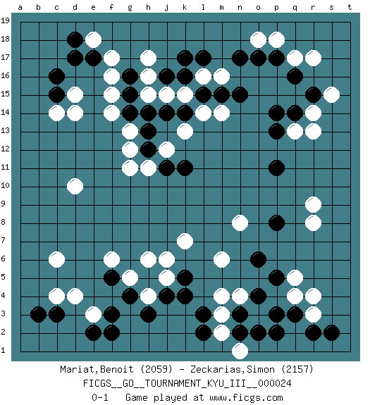 Last move : 0-1 2012 May 21 20:3:1 [Event "FICGS__GO__TOURNAMENT_KYU_III__000024 "] [Site "FICGS"] [Date "2012.02.21"] [Round "1"] [Black "Mariat,Benoit "] [White "Zeckarias,Simon "] [Result "0-1"] [Rating 1 "2059"] [Rating 2 "2157"] 1.q16 d4 2.q3 d15 3.d17 q5 4.o4 r3 5.r2 r4 6.p2 r8 7.f3 c6 8.k4 f16 9.c15 c14 10.c16 d14 11.k16 e18 12.d18 r14 13.q14 q13 14.p14 r17 15.r15 q17 16.p17 p18 17.o17 o18 18.n17 r13 19.p13 s15 20.p11 d10 21.f5 e3 22.f2 m4 23.o6 m6 24.l2 m2 25.l3 o3 26.p3 n4 27.p5 q4 28.n3 m3 29.n2 n1 30.o2 k7 31.s2 j6 32.k5 n8 33.p8 r9 34.c3 c4 35.e2 h4 36.h5 j5 37.j4 g5 38.g4 h6 39.h3 f6 40.k11 g11 41.h12 g12 42.h13 h11 43.j11 g13 44.h14 h16 45.j16 h15 46.g14 f14 47.e17 f17 48.g15 f15 49.g16 h17 50.b3 j15 51.k14 k15 52.l15 l16 53.l17 m16 54.k17 l14 55.m15 m14 56.n15 k13 57.j14 j12 0-1 Here are the names of the openings (joseki) played in the four corners : Corner d16 : d15 d17Takamoku (Gomok, Gaomu`) 5-4 Point. The takamoku (high) point (5-4). With its emphasis on influence, the 5-4 point complements the 4-4 (hoshi) point in creating an influence-oriented fuseki.Komoku. White responds with 3-3, 3-5, 4-6, 4-7, 3-6, 3-7. Corner q4 : q3 q5Komoku (Somok, Xiao~mu`) 3-4 Point. The komoku (3-4) point is the traditional corner enclosure move..Ikken Takagakari (Hankan Nop'dakeolch'im, Yi Gaogua`jiao~, 1-Space High Approach). The 5-4 approach move has become more popular in modern times, as modern Go emphasizes speed and influence. Corner d4 : d4 f3Hoshi (Hwajeom, Seongjeom, Xingwei`) 4-4 Point. The star or hoshi (4-4) point, emphasizing influence at the potential expense of territory.Ikken Kakari (Hankan Keolch'im, Yi Gua`jiao~, 1-Space Low Approach). Black 2 is the standard approach move to the 4-4. Corner q16 : q16 r14Hoshi (Hwajeom, Seongjeom, Xingwei`) 4-4 Point. The star or hoshi (4-4) point, emphasizing influence at the potential expense of territory.Ikken Kakari (Hankan Keolch'im, Yi Gua`jiao~, 1-Space Low Approach). White 2 is the standard approach move to the 4-4. Player White won this Go (weiqi, baduk) game.Follow this game move after move (download ) Balance is not what players strike for, and if it does arise, it is in spite of them. (Pierre Audouard) If only faces could talk... (Pat Summerall, Sportscaster during the Super Bowl)