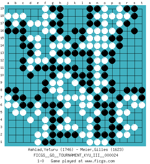 Last move : 1-0 2012 October 18 8:6:47 [Event "FICGS__GO__TOURNAMENT_KYU_III__000024"] [Site "FICGS"] [Date "2012.02.21"] [Round "1"] [Black "Aahlad,Yeturu"] [White "Meier,Gilles"] [Result "1-0"] [Rating 1 "1746"] [Rating 2 "1623"] 1.q16 d4 2.q3 r5 3.c16 e17 4.h16 e15 5.d14 g16 6.r8 s3 7.n3 s7 8.c7 c5 9.g4 f3 10.g3 f2 11.f6 o17 12.m17 o15 13.q14 q18 14.r17 r18 15.s8 r2 16.h17 h15 17.k16 g13 18.c11 l5 19.o13 k3 20.s18 n18 21.m18 q17 22.s16 p16 23.p15 p14 24.q15 o14 25.p13 m14 26.n6 j6 27.h6 h5 28.g5 j4 29.l7 h7 30.l10 c18 31.g6 k7 32.m8 m2 33.n2 l2 34.d6 b6 35.b7 g18 36.g17 f17 37.h18 f18 38.j15 h14 39.k13 n13 40.p5 q2 41.p2 n11 42.o11 n10 43.o10 r7 44.q7 q6 45.p6 q4 46.p4 q5 47.f11 n16 48.j8 j7 49.k8 l6 50.p8 g8 51.f8 g9 52.f9 b17 53.b16 d15 54.c15 e14 55.d13 e13 56.t7 t6 57.t8 s6 58.k11 e12 59.e11 d12 60.c12 d11 61.d10 n9 62.n17 o18 63.g2 o9 64.p9 m7 65.n7 l8 66.l9 l7 67.m12 n12 68.g10 h10 69.h11 j10 70.j11 h8 71.k10 k9 72.j9 h9 73.g19 o12 74.p12 k9 75.n19 o19 76.m19 f19 77.h19 m16 78.l16 j14 79.k14 r3 80.p3 e5 81.f1 e1 82.g1 e2 83.r19 q19 84.m13 l14 85.l15 m15 86.n14 p18 87.s19 n8 88.m9 o7 89.o8 n5 90.m11 n15 91.m10 n14 92.l13 o16 93.o5 m4 94.n4 m6 95.o6 m3 96.c6 b5 97.c17 b18 98.j2 e6 99.e7 a7 100.a8 a6 101.b8 f4 102.k2 j3 103.h4 h3 104.h2 j12 105.j13 h12 106.g15 f16 107.h13 g14 108.g12 f12 109.g11 o1 110.p1 n1 111.o2 m1 112.a17 a18 113.a16 d17 114.c14 1-0 Here are the names of the openings (joseki) played in the four corners : Corner q4 : q3 r5 Komoku (Somok, Xiao~mu`) 3-4 Point. The komoku (3-4) point is the traditional corner enclosure move.. Ikken Kakari (Hankan Keolch'im, Yi Gua`jiao~, 1-Space Low Pincer). The small knight move is the basic approach move to the 3-4 point stone. It has been continually used for over four centuries. There are limitless variations, with new moves constantly being discovered. White 2 opens the door to a treaure store of joseki. Corner d16 : c16 e17 Komoku (Somok, Xiao~mu`) 3-4 Point. The komoku (3-4) point is the traditional corner enclosure move.. Ikken Kakari (Hankan Keolch'im, Yi Gua`jiao~, 1-Space Low Pincer). The small knight move is the basic approach move to the 3-4 point stone. It has been continually used for over four centuries. There are limitless variations, with new moves constantly being discovered. White 2 opens the door to a treaure store of joseki. Corner d4 : d4 c7 Hoshi (Hwajeom, Seongjeom, Xingwei`) 4-4 Point. The star or hoshi (4-4) point, emphasizing influence at the potential expense of territory. Niken Kakari (Dukan Keolch'im, E`r Gua`jiao~, 2-Space Low Approach). White typically answers by 7-3 or 3-5 (which is not joseki). Corner q16 : q16 o17 Hoshi (Hwajeom, Seongjeom, Xingwei`) 4-4 Point. The star or hoshi (4-4) point, emphasizing influence at the potential expense of territory. Ikken Kakari (Hankan Keolch'im, Yi Gua`jiao~, 1-Space Low Approach). White 2 is the standard approach move to the 4-4. Player Black won this Go (weiqi, baduk) game. Follow this game move after move (download)Answer the keima with a kosumi. (Anonymous) Always remember that you are unique; just like everyone else. (Unknown)