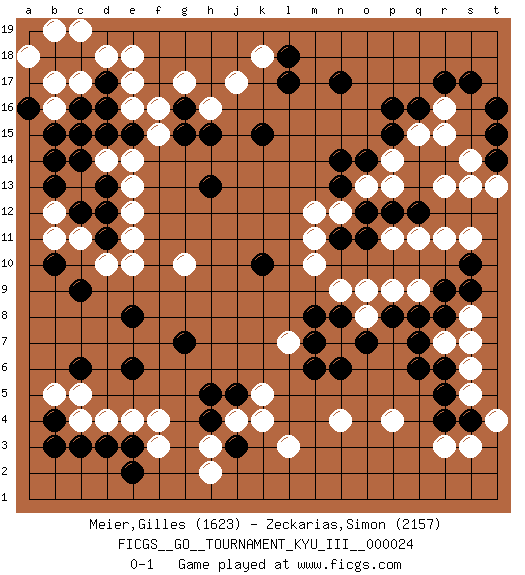 Last move : 0-1 2012 March 5 18:54:3 [Event "FICGS__GO__TOURNAMENT_KYU_III__000024"] [Site "FICGS"] [Date "2012.02.21"] [Round "1"] [Black "Meier,Gilles"] [White "Zeckarias,Simon"] [Result "0-1"] [Rating 1 "1623"] [Rating 2 "2157"] 1.q16 d4 2.c16 p4 3.r5 r3 4.q6 l3 5.c6 e16 6.d17 e17 7.c3 c4 8.d3 e4 9.e3 f4 10.c9 f3 11.b4 b5 12.b3 c5 13.e2 c11 14.b14 e10 15.b10 b11 16.e8 g10 17.e6 j17 18.n17 r16 19.r17 r15 20.s17 q15 21.p16 r11 22.r9 p11 23.p15 p14 24.g7 d14 25.o14 p13 26.k10 d18 27.c18 e18 28.l18 b17 29.b18 c17 30.d16 b16 31.c15 a18 32.a16 b19 33.b15 c19 34.d13 e13 35.e15 e14 36.d15 f15 37.d12 c13 38.c12 b12 39.b13 e12 40.d11 d10 41.c14 e11 42.h4 h3 43.j3 j4 44.j5 k4 45.h5 h2 46.m6 n4 47.h13 k18 48.l17 h16 49.n11 p9 50.s10 s11 51.t14 s14 52.t16 t13 53.t15 s13 54.q12 q11 55.s4 s3 56.g15 f16 57.k15 n12 58.o12 o13 59.n13 m12 60.p12 r13 61.o11 r7 62.q7 s8 63.r8 s6 64.s9 s5 65.r6 s7 66.r4 t4 67.p8 o8 68.o7 q9 69.q8 n7 70.n8 o9 71.n6 n9 72.m8 m11 73.n14 m10 74.g16 g17 75.h15 l7 76.m7 k5 0-1 Here are the names of the openings (joseki) played in the four corners : Corner q4 : p4 r5 Takamoku (Gomok, Gaomu`) 5-4 Point. The takamoku (high) point (5-4). With its emphasis on influence, the 5-4 point complements the 4-4 (hoshi) point in creating an influence-oriented fuseki. Corner d4 : d4 c6 Hoshi (Hwajeom, Seongjeom, Xingwei`) 4-4 Point. The star or hoshi (4-4) point, emphasizing influence at the potential expense of territory. Ikken Kakari (Hankan Keolch'im, Yi Gua`jiao~, 1-Space Low Approach). Black 2 is the standard approach move to the 4-4. Corner d16 : c16 e16 Komoku (Somok, Xiao~mu`) 3-4 Point. The komoku (3-4) point is the traditional corner enclosure move.. Ikken Takagakari (Hankan Nop'dakeolch'im, Yi Gaogua`jiao~, 1-Space High Approach). The 5-4 approach move has become more popular in modern times, as modern Go emphasizes speed and influence. Player White won this Go (weiqi, baduk) game. Follow this game move after move (download)Always remember, keep the balance. [between territory and influence] (Figaro) Without enthusiasm, virtue functions not at all, and vice only poorly. (Mignon McLaughlin, The Neurotic's Notebook, 1960)
