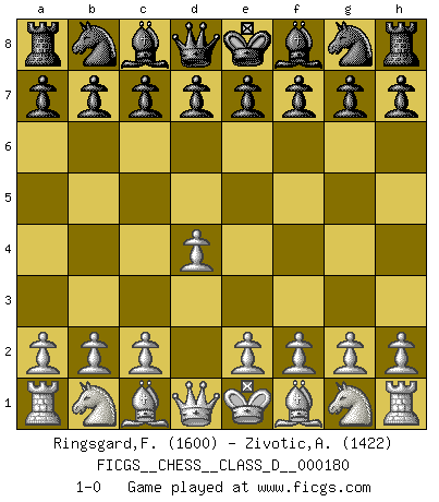 Last move : 1-0 2012 April 3 11:1:7 [Event "FICGS__CHESS__CLASS_D__000180"] [Site "FICGS"] [Date "2012.02.22"] [Round "1"] [White "Ringsgard,Fredrik Hasle"] [Black "Zivotic,Aleksandar"] [Result "1-0"] [WhiteElo "1600"] [BlackElo "1422"] 1.d4 1-0 This chess game has been lost on time (started : 2012.02.22 21:13:47) Queen's pawn Player White won this chess game. Follow this game move after move (download)You must take your opponent into a deep dark forest where 2+2=5, and the path leading out is only wide enough for one. (Mikhail Tal) Auf Remis zu spielen ist gewissermaßen ein Verbrechen gegen das Schachspiel. (Mikhail Nekhemyevich Tal) a manera como él juega al Ajedrez, demuestra la completa naturaleza de un hombre. (Stanley Ellin) Le pion, dans sa simplicité, marche droit devant lui, mais lorsqu'il prend, il le fait obliquement? Ainsi l'homme, tant qu'il reste pauvre, marche dans la droiture et vit honnêtement, mais lorsqu'il recherche les honneurs, il flatte, se parjure et, par les voies obliques, cherche une position supérieure sur l'échiquier du monde. (Jean de Galles) You can think I'm wrong, but that's no reason to quit thinking. (Gregory House, House M.D.)