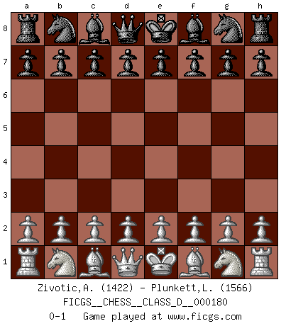Last move : 0-1 2012 April 2 22:59:41 [Event "FICGS__CHESS__CLASS_D__000180"] [Site "FICGS"] [Date "2012.02.22"] [Round "1"] [White "Zivotic,Aleksandar"] [Black "Plunkett,Louis"] [Result "0-1"] [WhiteElo "1422"] [BlackElo "1566"] 0-1 This chess game has been lost on time (started : 2012.02.22 21:13:47) Player Black won this chess game. Follow this game move after move (download)Via the squares on the chessboard, the Indians explain the movement of time and the age, the higher influences which control the world and the ties which link Chess with the human soul. (Al-Masudi) Ein Großmeister muß tausende Partien in seinem Kopf speichern, denn diese sind für Ihn, was die Worte der Muttersprache für gewöhnliche Leute sind, oder Noten für Musiker... (Garry Kasparov) El Ajedrez es un expediente tonto que hace creer a la gente inactiva que hacen una cosa muy astuta cuando solamente estan perdiendo su tiempo. (George Bernard Shaw) Les Echecs représentent une sphère d'idées créatrices basée sur la volonté des deux protagonistes. (Smyslov) Hold em is to stud what chess is to checkers. (Johnny Moss)