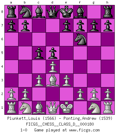 Last move : 1-0 2012 April 8 23:32:5 [Event "FICGS__CHESS__CLASS_D__000180"] [Site "FICGS"] [Date "2012.02.22"] [Round "1"] [White "Plunkett,Louis"] [Black "Ponting,Andrew"] [Result "1-0"] [WhiteElo "1566"] [BlackElo "1539"] 1.d4 Nf6 2.e3 d5 3.Bd3 c5 4.c3 1-0 This chess game has been lost on time (started : 2012.02.22 21:13:47) Queen's pawn game Player White won this chess game. Follow this game move after move (download)A passed Pawn increases in strength as the number of pieces on the board diminishes. (Capablanca) Vom Schach wurde gesagt das Leben sei dafür nicht lange genug. Aber das ist der Fehler des Lebens, nicht des Schach'. (Irving Chernev) No es una movida, aún la mejor movida que tu debas buscar, sino un plan comprensible. (Eugene Znosko-Borovsky) A chaque perte on perd un peu de soi. (Joël Lautier) Computers are like Old Testament gods; lots of rules and no mercy. (Joseph Campbell)