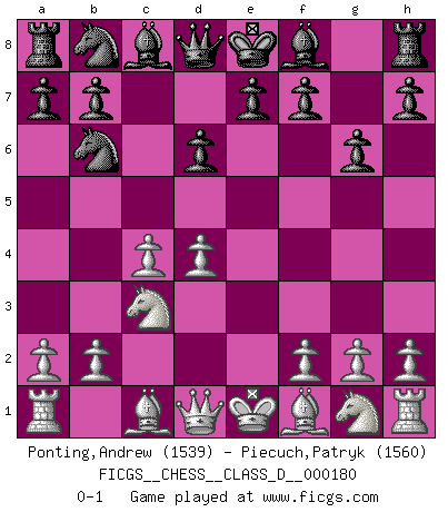 Last move : 0-1 2012 April 4 23:18:31 [Event "FICGS__CHESS__CLASS_D__000180"] [Site "FICGS"] [Date "2012.02.22"] [Round "1"] [White "Ponting,Andrew"] [Black "Piecuch,Patryk"] [Result "0-1"] [WhiteElo "1539"] [BlackElo "1560"] 1.e4 Nf6 2.e5 Nd5 3.d4 d6 4.c4 Nb6 5.exd6 cxd6 6.Nc3 g6 0-1 This chess game has been lost on time (started : 2012.02.22 21:13:47) Alekhine's defense : Exchange variation Player Black won this chess game. Follow this game move after move (download)In Chess, as it is played by masters, chance is practically eliminated. (Emanuel Lasker) Mein Gehirn das ist mein zweitwichtigstes Organ [Aus dem Film: Der Schläfer]. (Woody Allen) Una clavada es mas poderosa que una espada. (Fred Reinfeld) Le succès, c'est être capable d'aller d'échec en échec sans perdre son enthousiasme. (Winston Churchill) Good decisions come from experience, and experience comes from bad decisions. (Anonymous)