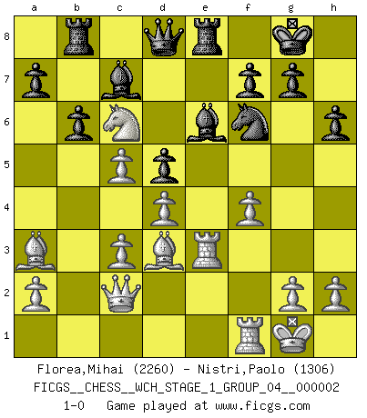 Last move : 1-0 2007 February 22 8:25:5 [Event "FICGS__CHESS__WCH_STAGE_1_GROUP_04__000002"] [Site "FICGS"] [Date "2007.01.16"] [Round "1"] [White "Florea,Mihai"] [Black "Nistri,Paolo"] [Result "1-0"] [WhiteElo "2260"] [BlackElo "1306"] 1.e4 e5 2.Nf3 Nf6 3.d4 Nxe4 4.Bd3 d5 5.Nxe5 Bd6 6.O-O O-O 7.c4 c6 8.Nc3 Nxc3 9.bxc3 Nd7 10.f4 Nf6 11.Qc2 h6 12.c5 Bc7 13.Ba3 Be6 14.Rab1 Rb8 15.Rbe1 Re8 16.Re3 b6 17.Nxc6 1-0 Petrov : Modern attack, Symmetrical variation Kingside Castling by player White (move 6) Kingside Castling by player Black (move 6) Player White won this chess game. Follow this game move after move (download)Strategy requires thought, tactics require observation. (Max Euwe) Stil? Ich habe keinen Stil! (Anatoly Karpov) La mitad de las variaciones que son calculadas en una partida de torneo, resultan ser completamente superfluas. Desafortunadamente, nadie sabe por adelantado cual mitad. (Jan Tinman) Le profane ne songe pas à la somme de jouissance dont il se prive, qui méconnaît ce jeu aux ressources aussi variées que passionnantes. (Jean-Marie Jeanton-Lamarche) Two beer, or not two beer. (Unknown)