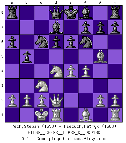 Last move : 0-1 2012 May 11 13:0:30 [Event "FICGS__CHESS__CLASS_D__000180"] [Site "FICGS"] [Date "2012.02.22"] [Round "1"] [White "Pech,Stepan"] [Black "Piecuch,Patryk"] [Result "0-1"] [WhiteElo "1590"] [BlackElo "1560"] 1.e4 c5 2.Nf3 d6 3.d4 cxd4 4.Nxd4 Nf6 5.Nc3 Nc6 6.Bg5 e6 7.Qd2 a6 8.O-O-O Bd7 9.f4 b5 0-1 This chess game has been lost on time (started : 2012.02.22 21:13:47) Sicilian : Richter-Rauzer, Rauzer attack, 7...a6 Queenside Castling by player White (move 8) Player Black won this chess game. Follow this game move after move (download)A Chess game is divided into three stages: the first, when you hope you have the advantage, the second when you believe you have an advantage, and the third... when you know you're going to lose ! (Savielly Tartakower) Man braucht nicht immer den besten Zug zu spielen: Ein Zug muß aktiv, unternehmungslustig, korrekt und schön sein. (David Bronstein) Robert Fischer es la ley hacia si mismo. (Larry Evans) Toutes les manuvres exécutées sur une colonne ouverte ont pour but ultime l'intrusion définitive sur la septième ou la huitième rangée, en plein cur de la position ennemie. (Aaron Nimzovitch) Games, world of games... There's always an opponent, and there's always a victim. (Revolver, movie)