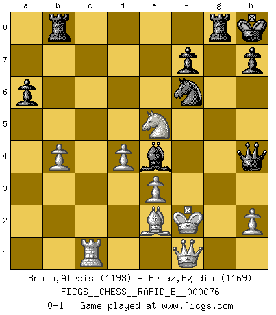 Last move : 0-1 2012 March 27 5:29:49 [Event "FICGS__CHESS__RAPID_E__000076"] [Site "FICGS"] [Date "2012.02.23"] [Round "1"] [White "Bromo,Alexis"] [Black "Belaz,Egidio"] [Result "0-1"] [WhiteElo "1193"] [BlackElo "1169"] 1.d4 d5 2.c4 Nf6 3.Nc3 dxc4 4.e3 e6 5.Nf3 Bb4 6.Bd2 b5 7.Nxb5 Bxd2+ 8.Qxd2 Ba6 9.Bxc4 O-O 10.a4 Ne4 11.Qc2 Nd6 12.Bd3 g6 13.Ne5 Nxb5 14.axb5 Bb7 15.O-O c6 16.b4 cxb5 17.Bxb5 a6 18.Bc4 Qg5 19.f4 Qh4 20.g3 Qd8 21.f5 exf5 22.g4 Be4 23.Qb3 Qe7 24.Rxf5 gxf5 25.gxf5 Qg5+ 26.Kf1 Qg2+ 27.Ke1 Qg1+ 28.Bf1 Bxf5 29.Rc1 Nd7 30.Nf3 Qg4 31.Ke2 Nf6 32.Qd1 Be4 33.Kf2 Kh8 34.Be2 Rg8 35.Qf1 Rab8 36.Ne5 Qh4+ 0-1 QGD : Marshall defense Kingside Castling by player Black (move 9) Kingside Castling by player White (move 15) Player Black won this chess game. Follow this game move after move (download)Chess is the art which expresses the science of logic. (Mikhail Botvinnik) Ich glaube nicht an Psychologie, ich glaube an gute Züge. (Robert James Fischer) Con o sin el título, Bobby Fischer fue sin lugar a dudas el mas grande jugador de su época. (Burt Hochberg) A chaque perte on perd un peu de soi. (Joël Lautier) They misunderestimated me. (George W. Bush, Bentonville nov. 6, 2000)