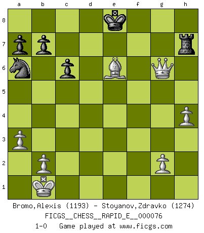 Last move : 1-0 2012 February 27 21:27:50 [Event "FICGS__CHESS__RAPID_E__000076"] [Site "FICGS"] [Date "2012.02.23"] [Round "1"] [White "Bromo,Alexis"] [Black "Stoyanov,Zdravko"] [Result "1-0"] [WhiteElo "1193"] [BlackElo "1274"] 1.d4 d5 2.c4 dxc4 3.Nc3 Bd7 4.e3 h6 5.Bxc4 e6 6.Nf3 Nf6 7.a3 Bd6 8.Bd2 O-O 9.Qc2 Bc6 10.e4 Be7 11.e5 Nfd7 12.d5 exd5 13.Nxd5 Bxd5 14.Bxd5 c6 15.Bb3 Nc5 16.O-O-O Nd3+ 17.Kb1 Nxf2 18.Bxh6 Nxd1 19.Rxd1 Qc7 20.Bg5 Na6 21.h4 Rad8 22.Rxd8 Rxd8 23.Bxe7 Qxe7 24.Ng5 g6 25.Qxg6+ Kf8 26.Nh7+ Ke8 27.Nf6+ Qxf6 28.Qxf6 Rd7 29.e6 fxe6 30.Bxe6 Rh7 31.Qg6+ 1-0 Queen's gambit accepted Kingside Castling by player Black (move 8) Queenside Castling by player White (move 16) Player White won this chess game. Follow this game move after move (download)Dazzling combinations are for the many, shifting wood is for the few. (Georg Kieninger) Das Schach hält seine Meister in eigenen Banden, Fesseln; auf vielerlei Weise formt es ihren Geist, so dass die innere Freiheit selbst des Stärksten beeinflusst wird. (Albert Einstein) La caracteristica mas importante en la posición del Ajedrez es la actividad de las piezas. Esto es absolutamente fundamental en todas las fases del juego: Apertura, Juego Medio y especialmente Finales. La limitación primordial en la actividad de una pieza, es la estructuración de los Peones. (Michael Stean) C'est une question de caractère, Beaucoup de gens perdent leur motivation très vite. D'autres, ils sont rares, peuvent la conserver très longtemps. J'aime les échecs, encore aujourd'hui je suis heureux d'analyser des parties. J'aime toujours gagner, je déteste encore perdre. Bien jouer est important pour mon intégrité intellectuelle et morale. Et puis les échecs vivent en ce moment une période historique grâce à Internet. Ils se développent dans les systèmes éducatifs à travers le monde. Ils sortent de leur ghetto, et c'est mon rôle de mener à bien cette révolution. (Gary Kasparov) The human is the only animal species whose members are able to talk themselves into difficulties that would not otherwise exist. (Wendell Johnson)