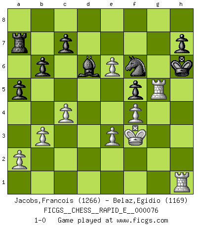 Last move : 1-0 2012 April 12 19:8:51 [Event "FICGS__CHESS__RAPID_E__000076"] [Site "FICGS"] [Date "2012.02.23"] [Round "1"] [White "Jacobs,Francois"] [Black "Belaz,Egidio"] [Result "1-0"] [WhiteElo "1266"] [BlackElo "1169"] 1.d4 d5 2.Nf3 e6 3.e3 Be7 4.Bd3 Nf6 5.O-O O-O 6.Nbd2 a5 7.c3 b6 8.Re1 Bb7 9.Qc2 Ba6 10.b3 Bxd3 11.Qxd3 Nc6 12.Bb2 Bd6 13.Rac1 Ne7 14.c4 Ne4 15.Nxe4 dxe4 16.Qxe4 Ng6 17.h4 Qc8 18.Ng5 f6 19.Qxe6+ Qxe6 20.Nxe6 Rfe8 21.d5 Ra7 22.f4 Nxh4 23.Kf2 Nf5 24.g4 Nh6 25.Rh1 Nxg4+ 26.Kf3 f5 27.Bxg7 Rxe6 28.dxe6 Kxg7 29.Rh5 Nf6 30.Rg5+ Kh6 31.Rh1+ 1-0 Queen's pawn game Kingside Castling by player White (move 5) Kingside Castling by player Black (move 5) Player White won this chess game. Follow this game move after move (download)The game of chess is the touchstone of the intellect. (Goethe) Ich habe die besten Aussichten, den ersten Preis zu gewinnen - denn jeder muss gegen Steinitz spielen, nur ich nicht! (Wilhelm Steinitz) Bendita sea la memoria de aquel que dio al mundo este juego inmortal. (A. G. Gardiner) Tous ces prétendus hommes politiques sont les pions, les Cavaliers, les Tours ou les Fous d'une partie d'échecs qui se jouera tant qu'un hasard ne renversera pas l'échiquier. (Honoré de Balzac) No enterprise is more likely to succeed than one concealed from the enemy until it is ripe for execution. (Niccolo Machiavelli)