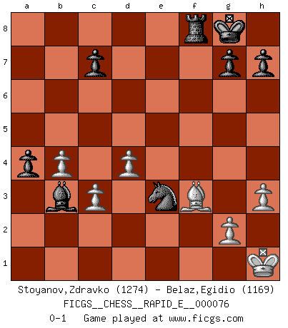 Last move : 0-1 2012 March 24 16:45:42 [Event "FICGS__CHESS__RAPID_E__000076"] [Site "FICGS"] [Date "2012.02.23"] [Round "1"] [White "Stoyanov,Zdravko"] [Black "Belaz,Egidio"] [Result "0-1"] [WhiteElo "1274"] [BlackElo "1169"] 1.e4 e5 2.Nf3 d6 3.h3 Nf6 4.c3 Be7 5.a3 O-O 6.d3 Nc6 7.Be2 a5 8.O-O b5 9.Re1 a4 10.Be3 Na5 11.Nbd2 Bb7 12.b4 Nc6 13.Kh1 d5 14.exd5 Nxd5 15.Ne4 f5 16.Neg5 Nxe3 17.fxe3 Bxg5 18.d4 e4 19.Nxg5 Qxg5 20.Bf1 f4 21.Qe2 f3 22.Qc2 f2 23.Re2 Qh4 24.Ra2 Ne7 25.Rxf2 Bd5 26.Rb2 Bb3 27.Qd2 Nd5 28.Qe1 Qg5 29.Rxf8+ Rxf8 30.Bxb5 Nxe3 31.Rf2 Rb8 32.Bc6 Nc2 33.Qd2 e3 34.Qc1 exf2 35.Qf1 Rf8 36.Bf3 Nxa3 37.Qxf2 Nc2 38.Qe2 Qe3 39.Qxe3 Nxe3 0-1 Philidor's defense Kingside Castling by player Black (move 5) Kingside Castling by player White (move 8) Player Black won this chess game. Follow this game move after move (download)The beauty of a move lies not in its' appearance but in the thought behind it. (Siegbert Tarrasch) Rauchen ist dem Schachspieler bei seiner Arbeit, also im Wettkampf, untersagt. (Viktor Kortschnoi) Fischer no está bajo la obligación de nadie. (Joseph Platz) Les pièces de l'échiquier étaient impitoyables. Elles le retenaient, elles l'absorbaient. Il y avait de l'horreur en cela, mais aussi une harmonie unique. Car, qu'y a-t-il dans le monde, à part les échecs ? (V. Nabokov) The quality of decision is like the well-timed swoop of a falcon which enables it to strike and destroy its victim. (Sun Tzu)