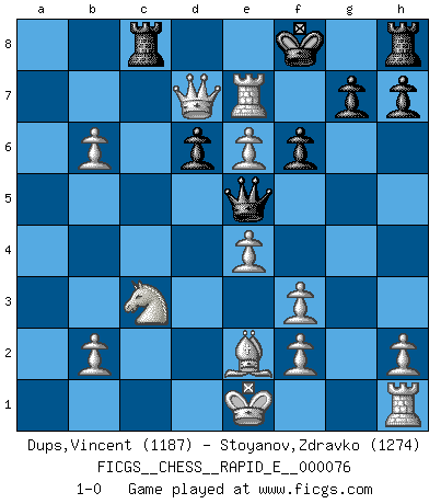 Last move : 1-0 2012 February 27 21:5:8 [Event "FICGS__CHESS__RAPID_E__000076"] [Site "FICGS"] [Date "2012.02.23"] [Round "1"] [White "Dups,Vincent"] [Black "Stoyanov,Zdravko"] [Result "1-0"] [WhiteElo "1187"] [BlackElo "1274"] 1.e4 c5 2.Nf3 a6 3.c3 Nc6 4.d4 cxd4 5.cxd4 d6 6.Nc3 Bg4 7.Be2 Nf6 8.d5 Bxf3 9.gxf3 Na7 10.Qb3 Qc7 11.Be3 b5 12.a4 Nd7 13.axb5 Nc5 14.Bxc5 Qxc5 15.Rxa6 e6 16.dxe6 f6 17.b6 Be7 18.Qa4+ Kf8 19.Rxa7 Rc8 20.Rxe7 Qe5 21.Qd7 1-0 Sicilian : O'Kelly variation Player White won this chess game. Follow this game move after move (download)It was clear to me that the vulnerable point of the American Grandmaster (Bobby Fischer) was in double-edged, hanging, irrational positions, where he often failed to find a win even in a won position. (Efim Geller) Ich trinke, ich rauche, ich spiele, ich liebe Frauen aber Fernschach ist ein Laster, das ich nicht habe. (Mikhail Nekhemyevich Tal) Si un gobernante no entiende al Ajedrez, ¿como puede governar él un reinado?. (El Rey Khusros II) D'abord les bases : Jouez et étudiez, puis étudiez et jouez, ensuite jouez et étudiez, puis étudiez et jouez. Deuxièmement : Donnez toujours le meilleur de vous-même ! (Ken Smith) Home computers are being called upon to perform many new functions, including the consumption of homework formerly eaten by the dog. (Doug Larson)
