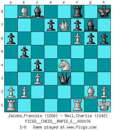 Last move : 1-0 2012 April 4 23:56:25 [Event "FICGS__CHESS__RAPID_E__000076"] [Site "FICGS"] [Date "2012.02.23"] [Round "1"] [White "Jacobs,Francois"] [Black "Neil,Charlie"] [Result "1-0"] [WhiteElo "1266"] [BlackElo "1142"] 1.e4 e6 2.d3 c5 3.Nd2 Nc6 4.Ngf3 Nge7 5.g3 g6 6.Bg2 Bg7 7.Qe2 O-O 8.c3 b5 9.O-O Ne5 10.Nxe5 Bxe5 11.f4 Bg7 12.e5 Rb8 13.Ne4 Qc7 14.Qf2 Nf5 15.g4 Ne7 16.Nf6+ Kh8 17.Qh4 h6 18.f5 Qxe5 19.Ne4 exf5 20.Bf4 Qd5 21.Bxb8 Qxd3 22.Qxe7 Qe3+ 23.Kh1 c4 24.gxf5 a6 25.f6 1-0 French : King's Indian attack Kingside Castling by player Black (move 7) Kingside Castling by player White (move 9) Player White won this chess game. Follow this game move after move (download)Capture of the adverse King is the ultimate but not the first object of the game. (William Steinitz) Nur ein wirklich starker Spieler weiß wie schwach er spielt. (Savielly Grigorievitsch Tartakower) El Ajedrez es parte de la cultura, y si una cultura esta en decadencia, entonces también el Ajedrez declinará. (Mikhail Botvinnik) Il a essayé de se convaincre qu'il pourrait empêcher toutes les erreurs et ne jamais perdre. L'horreur ! Gary Kasparov au sujet de Robert Fischer. Somehow our devils are never quite what we expect when we meet them face to face. (Nelson DeMille)